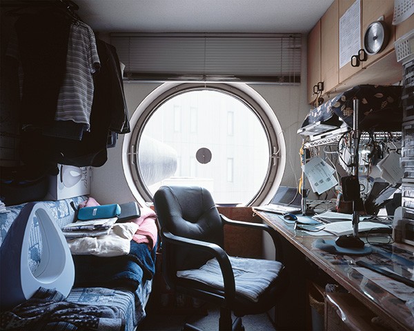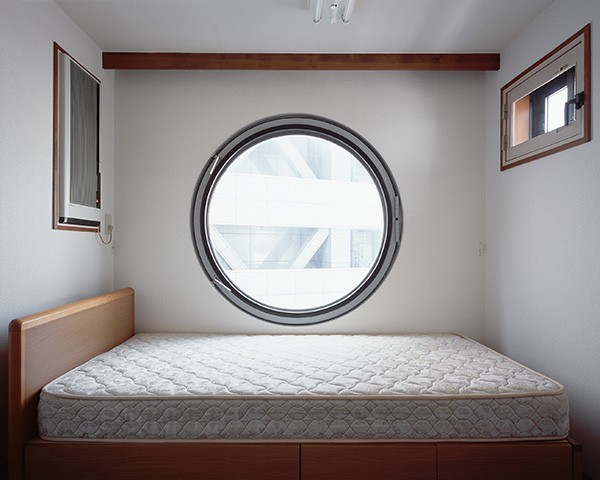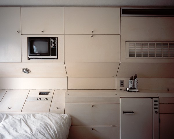 What about the rest of the photographs, the 49 that aren't in those two gatefolds? They reveal a lot of variation between the two poles of emptiness and ruin. Some capsules, such as the one that wraps around the front and back covers, have the original casework, a feature that now looks like a distant past's idea of the future, one that has been superseded in the intervening years. Built-in TVs, radios, and other electronics reinforce the anachronistic nature of the capsule's built-ins. Most of the capsules appear to have had the built-ins removed, with desks, shelves, and other furniture taking their place. What is constant in the capsules are the round windows, always in the center of Minami's photos but never in exactly the same place, a result of the tripod navigating the unique living circumstances of each capsule, something pointed out in Julian Rose's illuminating essay.