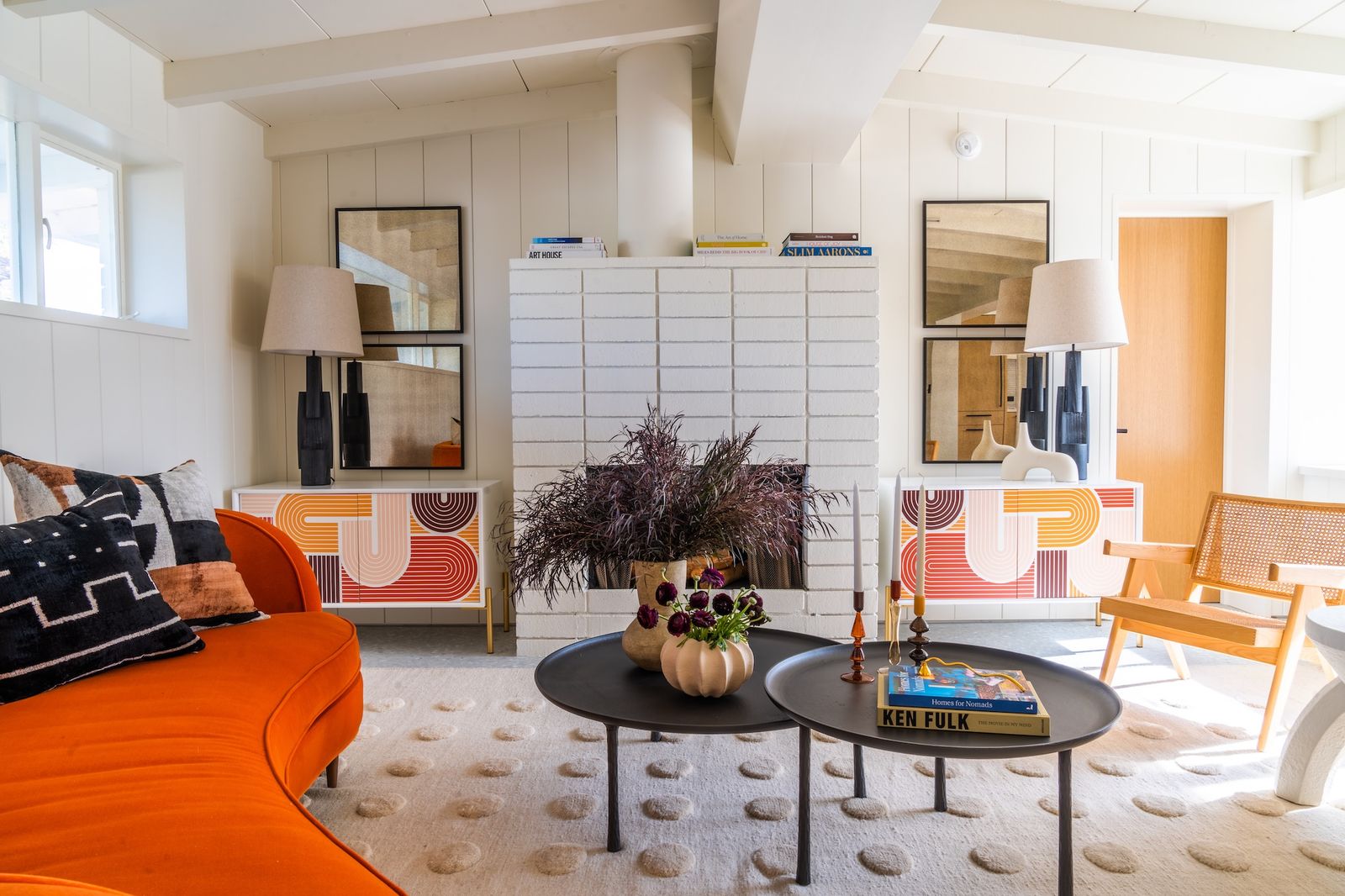 In the living room—affectionately dubbed the "Sunset Lounge"—curved orange velvet seating is reminiscent of the palette of desert skies, while the original fireplace takes center stage. As a natural focal point of the living space, the entire furniture layout is designed to revolve around it. The fireplace is flanked by two credenzas with bright orange, red, and pink patterned fronts—another nod to the dramatic sunsets Palm Desert is known for and the home’s origins.