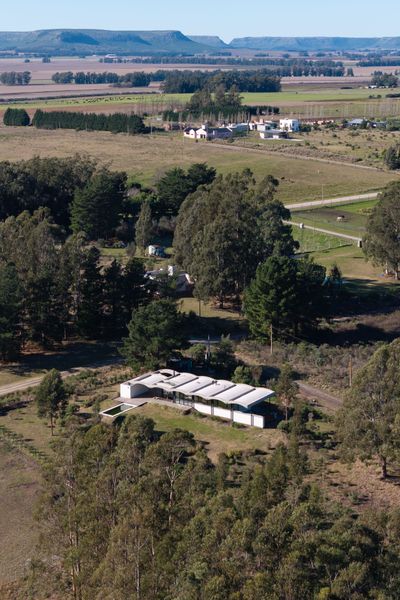From the Architect: "On the outskirts of Balcarce, Argentina, a mountain ridge appears interrupted by a precise void: a clean cut in the slope, a missing piece that becomes a signal. The house takes this ‘bite’ as its starting point and organizes all of its material around that absence. Rather than an isolated object, it is conceived as a device for looking: a heavy roof aligned with the silhouette of the ridge that establishes, in the foreground, a new geometry from which to read the landscape again.