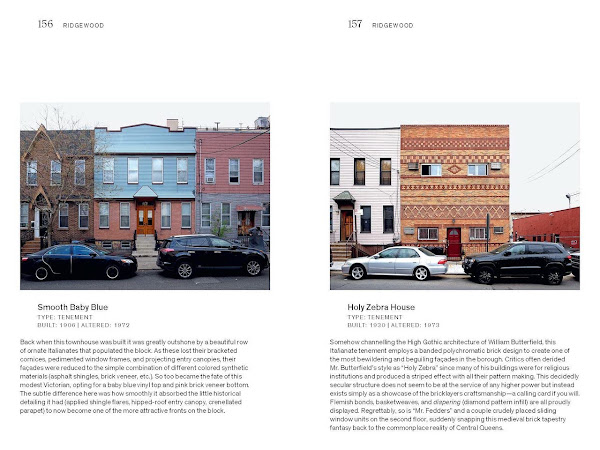 So it seems Astoria has a riches of quirky residential architecture, be it single family houses or apartment buildings. (My other frequently used tag, #astoriaportal, is aligned with the area's courtyard apartment buildings.) But Astoria is not alone, as All the Queens Houses makes abundantly clear. Herrin-Ferri, unlike myself, has trekked the entirety of the borough, akin to the late William B. Helmreich, photographing its many blocks and focusing on its smaller-scale residential pieces. The diversity of the borough's architectural character is front and center in the photographs, thanks in part to his preference for overcast days, something he determined after some months of his survey because "varying amounts of direct sunlight were distorting the true colors of the structures and casting long shadows that would obscure the most interesting features." So Herrin-Ferri is an anti-architectural photographer, setting out on gray days rather than sunny ones. With evenly gray skies throughout the book, the colors and forms of the houses — each one front in the middle of the page, free of people but often fronted by cars — jumps off the page.