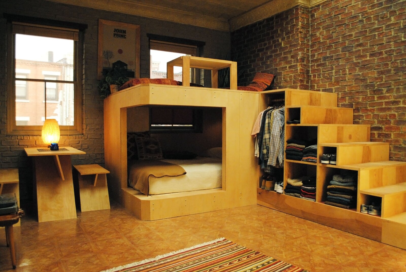 At less than 200 square feet, the tiny studio is a marvel of space-saving design. Gorgeous birch plywood is everywhere you look. The star of the show is a loft-like platform with staggering steps that hold an open-faced closet underneath, and a partially enclosed sleeping area neatly tucked below. On one wall stands built-in shelving shaded with a selection of colors that feel equally influenced by Dutch painter Piet Mondrian and the famous Eames storage unit. The shelves house vinyl records, guitars, and some tchotchkes, painting a portrait of a twenty-something man with twenty-something man hobbies. The simplistic wooden dining table has a Donald Juddesque quality to it. A vintage-inspired screen print hangs above the platform on a white-painted brick wall. Antique rugs are artfully layered over the cheap linoleum floor.