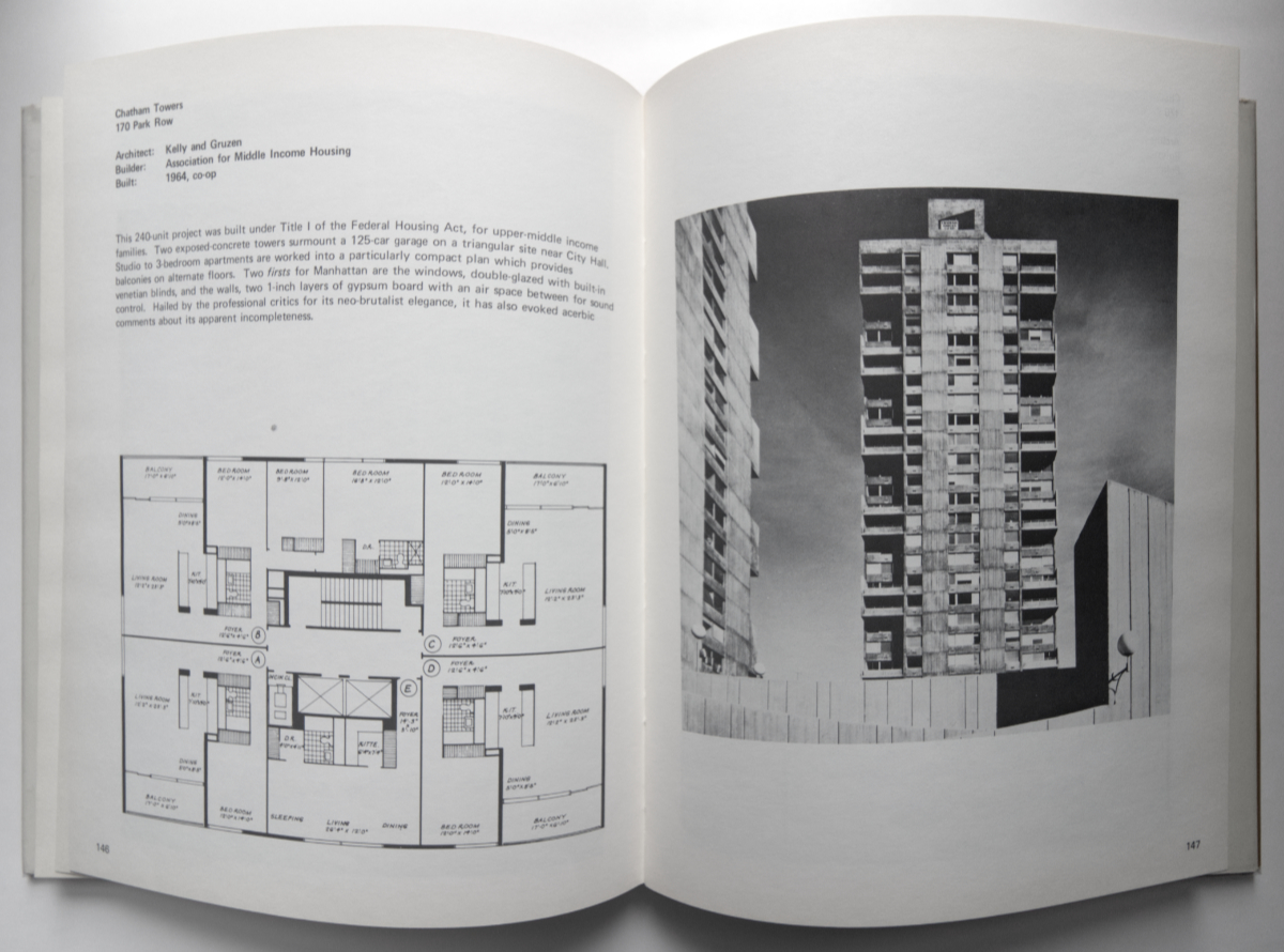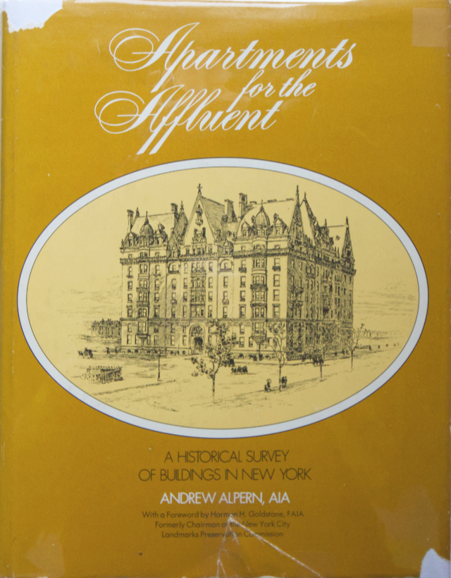 Apartments for the Affluent: A Historical Survey of Buildings in New YorkAndrew AlpernMcGraw-Hill, 1975Hardcover | 8-1/2 x 11 inches | 166 pages | English | ISBN: 978-0070013728PUBLISHER'S DESCRIPTION (from dust jacket): Lavishly illustrated, this volume portrays more than seventy of Manhattan's most famous apartment houses, from the first one in 1869 through those of the present day. Informative, entertaining, and lively it recounts the fascinating history of "flats" for those with social standing and for those who aspired to make their way into society. The first work to systematically document the development of luxury apartments, the book traces the development of apartment houses, tells about some of their peculiarities, and examines a number of unusual buildings. The buildings represented have been selected either because they are typical of a certain type or because they are unique. The book includes detailed floor plans and contains more than one hundred interior and exterior photographs that reveal the splendor of bygone days and show what is happening today. Andrew Alpern is Director of Architecture for Environmental Research & Development, a multinational space planning and design firm. A native of New York City, he has lived in apartment houses all his life, making him well qualified to write this book. Mr. Alpern is a registered architect and a graduate of the Columbia University Graduate School of Architecture and Planning. REFERRAL LINKS: dDAB COMMENTARY: My review a few days ago of Andrew Alpern's latest book, Post Portals, prompted me to look at one of his first, Apartments for the Affluent, first published in 1975 and later repackaged under different names (e.g., New York's Fabulous Luxury Apartments). Although the two books share New York City apartment buildings for people of means as their subjects, the earlier book amends its bevy of buildings from the late 19th and early 20th centuries with then-recent towers that were clearly modern. There is a noticeable, dramatic jump in the chronological presentation of apartment buildings — one two-page spread is devoted to each building — from a building on East End Avenue designed by Charles A. Platt in 1931 to the Butterfield House built in Greenwich Village in 1962. The latter (third spread below) reveals how a lot changed in those ensuing three decades, as the dozen projects that follow it also attest. Beyond the architectural style and expression captured in photographs, change is also apparent in the floor plans that document all of the 73 apartment buildings in Apartments for the Affluent. The inclusion of them is the book's most appealing feature, aided by the fact that almost all of them are clearly legible, easy to "read." The most dramatic difference between the prewar apartment plans and those closer to the book's 1975 publication date is the allotment of maid and servant quarters, and similarly separate entrances for service. Take The Dakota, the famous 19th-century apartment building on the Upper West Side that Alpern wrote a whole book about. The floor plan (first spread below) shows eight apartments, each of them accessed by a stair or elevator near the inside corners; kitchens and servant quarters, though, are located toward the courtyard and have separate circulation cores (they're easiest to see in the bump outs at the top and bottom sides of the courtyard). Jumping forward to the buildings near the end of the book, such as the Butterfield House, it's easy to see that the unit plans are considerably smaller, more open spatially, and free of appointments for service. The floor plans express the dramatic changes in lifestyle that happened over the 20th century, courtesy of technology, economics, and other fairly obvious factors. But just as the plans from the 1960s and 70s are consistent with today's developments geared to middle- and upper-class residents, there is also a noticeable circling back to the early projects in today's luxury apartment towers clustered along "Billionaire's Row" — our 21st-century Gilded Age, if you will. If Alpern were to update his book to make it current and include floor plans from such luxury apartment buildings as 15 Central Park West, readers would find the reappearance of maid's rooms, at least in the larger units. Likewise, market-rate condominiums this century are catering to buyers, especially young ones, through loads of amenities, mainly fitness centers and shared rooftops. But Alpern revealed four decades ago how, for instance, The Hendrik Hudson in Morningside Heights was built in 1907 with a billiard room, cafe, roof terrace, and even a barber shop. In amenities, services, and perhaps much more, NYC apartments have apparently come full circle. SPREADS: