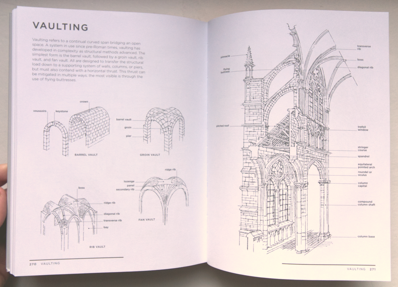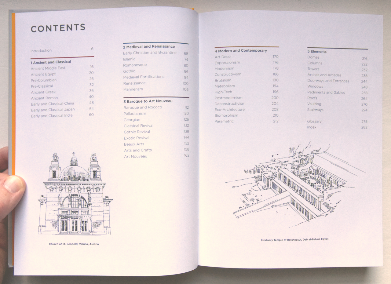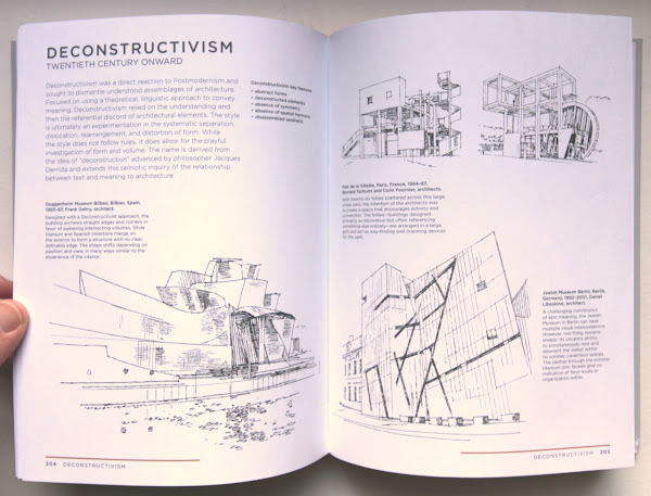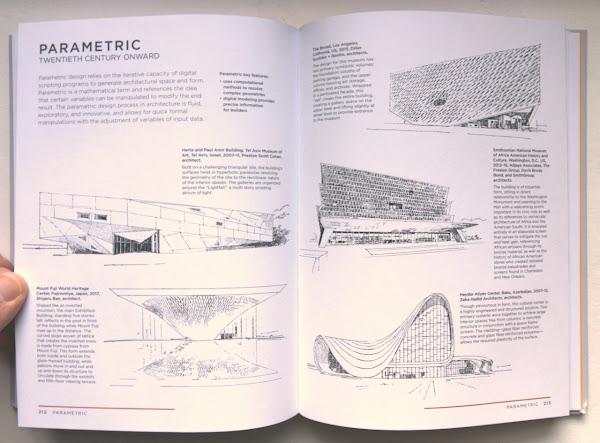 Architectural Styles: A Visual GuideMargaret Fletcher, Robbie PolleyPrinceton University Press, December 2020Hardcover | 7 x 9 inches | 288 pages | 600 illustrations | English | ISBN: 978-0691208077 | $29.95PUBLISHER'S DESCRIPTION: Architectural Styles is an incomparable guide to architectural styles across the centuries and around the world. Modeled after an architect’s plein air sketchbook, the volume features hundreds of detailed drawings by esteemed architectural illustrator Robbie Polley alongside incisive and informative descriptions. This unique guidebook takes readers from Europe and the Americas to Egypt, China, and India. It covers a host of historical and contemporary architectural styles, from ancient and classical to Pre-Columbian, Romanesque, Renaissance, Palladian, art nouveau, Brutalist, and biomorphic. It describes the histories and characteristics of the building traditions of each era and region of the world, and looks at key architectural elements such as buttresses, spandrels, curtain walls, and oculi. The book also includes a section on building parts—from domes and columns to towers, arches, roofs, and vaulting—along with a detailed glossary and bibliography. Margaret Fletcher is associate professor of architecture at Auburn University. Her books include Constructing the Persuasive Portfolio: The Only Primer You'll Ever Need. Robbie Polley is an architectural illustrator who has worked on major architecture projects around the world. His books include Architecture Inside-Out: Understanding How Buildings Work. REFERRAL LINKS: dDAB COMMENTARY: Although it is squarely focused on one building type in one country, Virginia and Lee McAlester's A Field Guide to American Houses makes a strong argument for presenting architectural styles. The book — first published in 1984 and then substantially updated by Virginia three decades later — gives laypeople skills for making sense of the great number of houses spread across the United States, and it serves as a reference for architects and builders who are renovating or expanding existing houses. Historic preservation underlies the whole, with the composition and articulation of building elements anchoring the "field guide." Accordingly, the book's second edition falters somewhat when it tries to define contemporary houses, which are less beholden to style than the freedom to mash up architectural elements into designs that defy categorization. I couldn't help think of the McAlsters' book in reference to Architectural Styles: A Visual Guide, written by Auburn University professor Margaret Fletcher and illustrated by Robbie Polley, particularly in regards to purpose: what is the purpose of a book about architectural styles published when architecture is less and less defined by style? The most obvious answer is teaching people — all sorts of them, not just architecture students — about architectural history; giving them an understanding of the built world around them. A potential side effect of an emphasis on style and the architectural elements that comprise them is a preference for (neo)traditional over contemporary architecture. But the inclusion of Deconstructivism, the Parametric, and other "isms" in the Modern and Contemporary chapter indicates that Fletcher wants to give as a broad an overview as possible. She treats all styles clearly and evenly through a consistent format of brief descriptive texts, bullet points of key features, and descriptive captions accompanying Polley's line drawings of significant buildings. Flipping to the section on Deconstructivism in the Modern and Contemporary chapter (second spread below), it's hard to disagree with the notable buildings included: Bernard Tschumi's Parc de la Villette, Daniel Libeskind's Jewish Museum Berlin, Peter Eisenman's Wexner Center for the Arts, Zaha Hadid's Vitra Fire Station, and Coop Himmelb(l)au's UFA Cinema Center. All of these architects were included in the Deconstructivist Architecture exhibition at MoMA in 1988, as was Frank Gehry, whose own house in Santa Monica was one of the few projects at the time to capture the "absence of spatial harmony" and "disassembled aesthetic" — to pull two of Fletcher's bullet points from her text — in built form. Here Gehry's Vitra Fire Station and Guggenheim Museum Bilbao are used to help describe Deconstructivism, though his firm's use of computer software to realize the latter — and every Gehry building since — can also be seen as a precedent for the Parametric (third spread), which "relies on the iterative capacity of digital scripting programs to generate architectural space and form," in Fletcher's words. The Hadid building in that section makes perfect sense, but I'm confused by the inclusion of the NMAAHC designed by David Adjaye et. al.; the patterned screen may involve parametric scripting, but the form is something else, something more broadly contemporary. Modern and Contemporary is the last of four chronological style