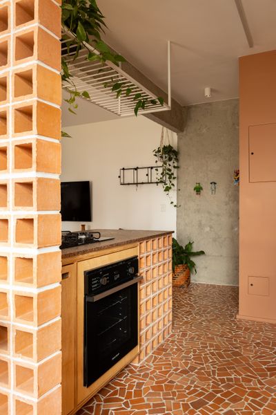 "Materiality plays a central role in the identity of the project. From the early stages of design, the clients’ references pointed toward materials associated with memory and affect, interpreted through contemporary solutions suitable for everyday living. Two elements deeply connected to São Paulo’s architectural culture, ceramic cobogó blocks and caquinhos tiles, became the defining components of the project. In the kitchen, these elements are organized as a strong and expressive terra-cotta-toned nucleus that structures the space. The cobogó blocks filter views and create subtle transitions between environments, while the caquinhos floor introduces texture and reinforces the tactile quality of the interior. The brushed red Brasília granite countertop completes this composition, reinforcing the chromatic unity of the space and establishing the kitchen as the central element of the apartment.