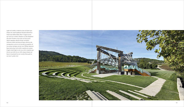 Château La Coste: Art and Architecture in ProvenceRobert Ivy, Alistair Hicks; photographs by Alan KarchmerMerrell Publishers, September 2020Hardcover | Page Size inches | 256 pages | 180 illustrations | English | ISBN: 978-1858946818 | $70.00PUBLISHER'S DESCRIPTION: Château La Coste, near Aix-en-Provence, is a unique property that features sculptural artworks by leading contemporary artists alongside works by some of the world’s best-known architects, all within the grounds of a working organic vineyard. Since 2002 the estate, which occupies an ancient site, has been transformed into a remarkable plein-air museum, and the number of installations – most created in situ, especially for this location – grows every year. In this stunning new book, Robert Ivy and Alistair Hicks explore each artwork and structure in depth. Their insightful commentaries are accompanied by specially commissioned images by the acclaimed architectural photographer Alan Karchmer. Ivy's introduction outlines the creation of the property by its owner, Patrick McKillen, and thereafter the book takes the form of a walk through the domaine, so that the reader is able to experience Château La Coste as a visitor would, from Tadao Ando’s minimalist concrete gate – an emphatic statement of modernity in the landscape – to Jean-Michel Wilmotte’s repurposed exhibition space, the Old Winestore Gallery. Throughout the pages, the reader is transported to idyllic Provence, to this enthralling, varied collection of art and architecture. Robert Ivy, FAIA, is an author, editor, architect and association executive. For more than fourteen years, he was Editor-in-Chief of one of the world's most widely disseminated and admired architectural publications, Architectural Record. Alistair Hicks is the author of The Global Art (2014), a survey of twenty-first-century art. For eighteen years, he was the Senior Curator at Deutsche Bank. REFERRAL LINKS: dDAB COMMENTARY: In the first paragraph of his opening essay, Robert Ivy describes Château La Coste, the collection of art and architecture outside of Aix-en-Provence, as "primarily experiential, a collection of real-life encounters in a virtual age." While that sentiment can be applied to pretty much all artworks, especially large-scale art en plein-air, as well as buildings and landscapes, explicitly stating it in regards to Château La Coste makes me wonder where the value of this book lies. If it's necessary to experience the buildings and sculptures situated next to the vineyards to appreciate them fully, then this book is ideally a souvenir for people who have visited and taken the Art & Architecture Walk. For those who haven't been, like myself, the coffee table book is therefore an invitation to go. (Like many cultural attractions, in Europe and elsewhere, Château La Coste is currently closed.) Before flipping through Château La Coste: Art and Architecture in Provence, I knew a small amount about a couple of its architectural pieces: the Music Pavilion (2008) designed by Frank Gehry (first spread below) and the Art Centre (2011) designed by Tadao Ando. But with 43 works in the book — 23 of them art artworks described by Alistair Hicks and 20 of them are architectural works with Robert Ivy's descriptions — I was surprised many times throughout. Ando, for one, has contributed other pieces, including an entrance Gate, a Chapel, a Pavilion ("Four Cubes to Contemplate Our Environment"), and some benches, most of them also completed in 2011. There are also buildings by Jean Nouvel (Wineries, 2008) and Renzo Piano (Exhibition Pavilion, 2017), a few Jean Prouvé demountable structures, and some artworks that are highly architectural in nature, such as Andy Goldsworthy's Gold Room (2009), Per Kirkeby's Brick Labyrinth (2018), Liam Gillick's Multiplied Resistance Screened (2010), and Daniel Buren's Une pause colorée (2014). Patrick McKillen, who created Château La Coste and invites the artists and architects to contribute to it, clearly has a good eye, as well as a beautiful piece of land. With the book ordered according to the geography of the many-acre landscape and the route of the Art & Architecture Walk, I pined for a map or aerial keyed to the 43 works documented in words and images. Alas there is none, though there are a few aerial views inserted sporadically throughout the book. But without labels they are not as helpful as this aerial drawing on the Château La Coste website. So sans a solid illustration for orienting oneself in the landscape from a distance, it's Alan Karchmer's photographs that come to the fore as the primary means of conveying the experiential qualities of the place. They pair well with the words of Ivy and Hicks, especially when they transport us to the place, like when Hicks describes the "earthy smell" of Goldsworthy's Oak Room. The photos are beautiful, I'll admit, and they do their part in making me want to visit Provence at some point in my life, to walk among McKillen's