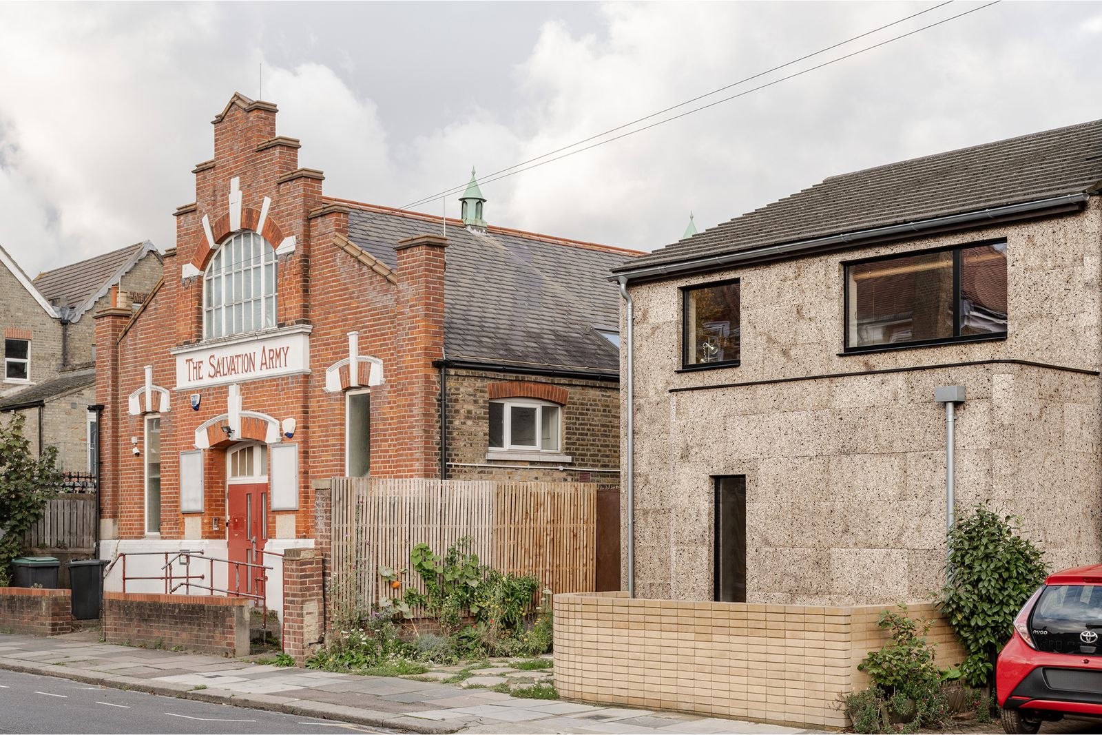 From the Architect: "This retrofit of a cold, leaky, and uninspiring 1970s building using predominantly natural, local, and recycled materials led to a warm, low-energy, and fossil-fuel-free family home. The site is in South Tottenham, England, which ranks in the 95th percentile for air pollution nationally. The home was originally built as a clergy house for the church next door. The ground floor was remodeled to an open-plan layout, bringing the small garage and porch into the thermal envelope. A decision was taken early not to extend the property, but to make good use of what was already there, spending budget predominantly on infrastructure and technical performance; removal of gas supply, installation of an air-source heat pump, underfloor heating, new doors and windows, cork cladding, extensive insulation work, and a huge endeavor to improve air-tightness. Thick cork and softly rounded edges make a striking presence on the street, yet the house is not imposing; smaller than surrounding buildings, it is warm, welcoming and open to the street. The cork cladding should last for 15-25 years at which point our contingency plan is to render over it with lime giving it a fresh look and protecting the insulation for many more years."