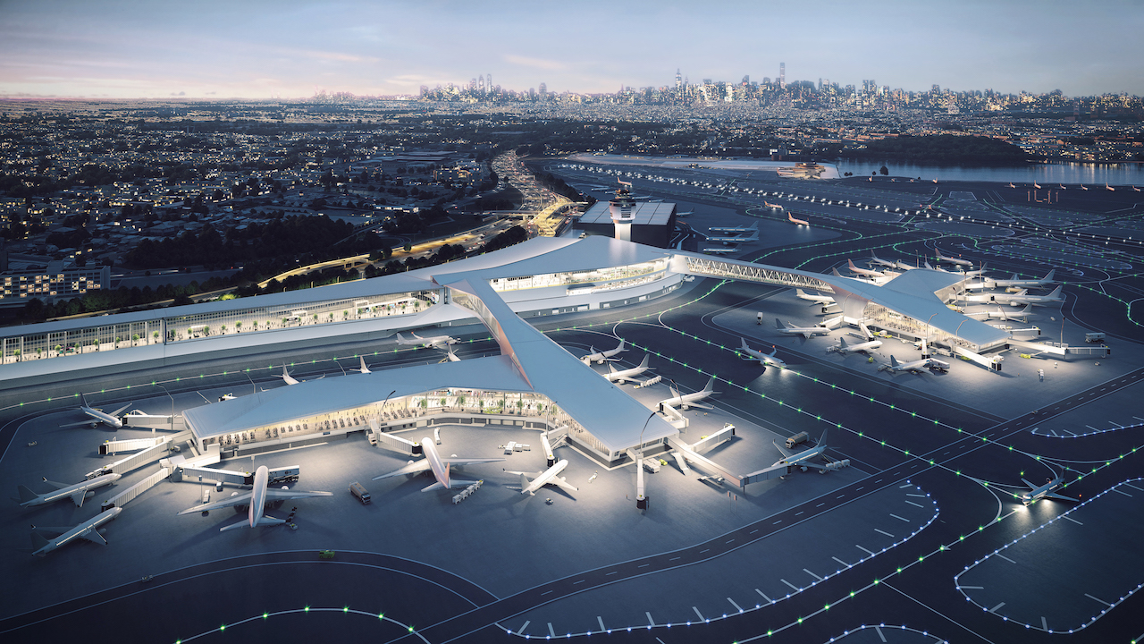 | Rendering of LaGuardia Airport with New York skyline in the distance. Image courtesy of HOK and WSP. |
