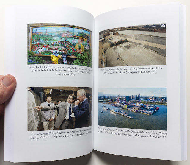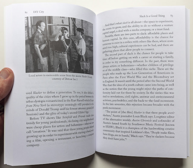 DIY City: The Collective Power of Small ActionsHank DittmarIsland Press, June 2020Paperback | 5-1/4 x 8 inches | 166 pages | 25 illustrations | English | ISBN: 978-1642830521 | $30.00PUBLISHER'S DESCRIPTION: Some utopian plans have shaped our cities —from England’s New Towns and Garden Cities to the Haussmann plan for Paris and the L’Enfant plan for Washington, DC. But these grand plans are the exception, and seldom turn out as envisioned by the utopian planner. Inviting city neighborhoods are more often works of improvisation on a small scale. This type of bottom-up development gives cities both their character and the ability to respond to sudden change. Hank Dittmar, urban planner, friend of artists and creatives, sometime rancher, “high priest of town planning” to the Prince of Wales, believed in letting small things happen. Dittmar concluded that big plans were often the problem. Looking at the global cities of the world, he saw a crisis of success, with gentrification and global capital driving up home prices in some cities, while others decayed for lack of investment. In DIY City, Dittmar explains why individual initiative, small-scale business, and small development matter, using lively stories from his own experience and examples from recent history, such as the revival of Camden Lock in London and the nascent rebirth of Detroit. DIY City, Dittmar’s last original work, captures the lessons he learned throughout the course of his varied career—from transit-oriented development to Lean Urbanism—that can be replicated to create cities where people can flourish. Hank Dittmar (1956–2018) was the founding principal of Hank Dittmar Associates, an international urban planning firm. Before that, he was chief executive of The Prince’s Foundation for Building Community, leading the foundation in contributing to the design of our built environment at practical and policy levels both in the UK and internationally. REFERRAL LINKS: dDAB COMMENTARY: I'll admit that I fall prey to first impressions often, regardless of how many times I try not to. In the case of DIY City by the late Hank Dittmar, that first impression came during what I do every time I tackle a new book: flipping through it quickly to look at the pictures. Standing out was one of the color photos in the middle of the book (first spread below), the one showing Dittmar with Prince Charles as the pair was "considering a plan with graduate fellows" in 2010. Back then, Dittmar was chief executive of the Prince's Foundation for Building Community, which (now simply The Prince's Foundation) aims to realize "HRH The Prince of Wales' vision of creating harmonious communities." For me — someone who is aligned with the Prince's embrace of walkable, sustainable communities but detests the style wars he was fond of starting in favor of neotraditional architecture — this was a red flag. But not wanting one image to sway me, I delved into the book, starting with a chapter where the apparent antithesis of Prince Charles was found. At the beginning of chapter five, "Slack Is a Good Thing," is a still from Slacker, the 1990 film debut of Richard Linklater. Featuring a meandering story following a cast of quirky characters across Austin, Texas, the low-budget film embraces a point of view very much at odds with creations like Poundbury. But to Dittmar, who became friends with Linklater through Dittmar's wife and who includes snippets of conversations with the filmmaker in the chapter, Slacker was not about being lazy, it was not about lounging around at home drinking beer instead of working. It was about taking the time between college and career to explore creativity and expression; it was about being self-motivated; it was about working, but not the kind of work that related to market forces. The urban equivalent of Slacker — or "slack" — are the empty lofts where young artists can live and work because they're cheap, for instance, as well as a city willing to foster such scenes. Dittmar's idea of "slack," though, is very close to Richard Florida's "creative class," meaning that we've gone from Prince Charles to gentrification: after the artists turn a formerly industrial area into a cool place that is relatively safe, young professionals move in, developers follow, and it's just a matter of time before the area is home to luxury brands and class A office space. Dittmar was well aware of that slippery slope, hence his embrace of the small — the DIY — within the context of top-down planning and development. Dittmar favored "providing people with access to tools and people then using those tools to exploit gaps in a system that is engineered for large organizations and large numbers." Yet just as Dittmar acknowledges the inequality that persists in cities, DIY has its own inequalities. Which citizens are able to band together to create a place, for instance, that their local government fails to provide? More often than not, it's the ones who can