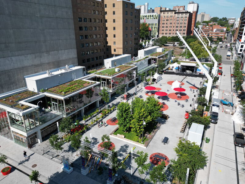 The Esplanade Tranquille constitutes the last phase of a project to develop the public spaces of the West Pole of the Quartier des Spectacles in Montreal. Its name pays tribute to the Tranquille Bookstore, once located on the site, an important place in the contemporary history of Quebec where the Refus global manifesto was launched in 1948.