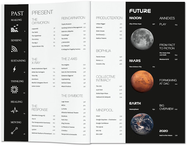 Formgiving: An Architectural Future HistoryBIG - Bjarke Ingels GroupTaschen, December 2020Paperback | 6-1/2 x 9-3/4 inches | 736 pages | English | ISBN: 978-3836577045 | $50.00PUBLISHER'S DESCRIPTION: Formgiving. An Architectural Future History, the new book by BIG (Bjarke Ingels Group), is a visionary attempt to look at the horizon of time. The Danish word for “design” is “formgivning,” which literally means to give form to that which has not yet taken shape. In other words, to give form to the future. Using our power to give form, rather than allowing the future to take shape, is more important now than ever, as humankind’s impact on the planet continues to increase and pose ever greater challenges to all life forms. Architecture plays a special role by proposing spaces for our lives that are fragments of the future in the making. William Gibson’s words embody architecture’s role perfectly: “The future is already here—it’s just not evenly distributed.” With Formgiving, BIG presents the third part of its TASCHEN trilogy, which began with Yes is More, one of the most successful architectural books of its generation, and continued with Hot to Cold. An Odyssey of Architectural Adaptation. The book is presented in a timeline, stretching from the Big Bang into the most distant future. Projects are structured around six strands of evolution—“Making,” “Sensing,” “Sustaining,” “Thinking,” “Healing,” and “Moving”—the multimedia-based, interdisciplinary concepts encompassing the building industry. Culture, climate, and landscape, as well as all the energies derived from the elements—the thermal mass of the ocean, the dynamics of currents, the energy and warmth of the sun, the power of the wind—are incorporated into these projects. Throughout more than 700 pages, Bjarke Ingels presents his personal selection of projects, including the 12,000-square-meter LEGO House in Denmark, the human-made ecosystems floating on oceans, the redesign of a World War II bunker into a contemplative museum, and the ski slope-infused power plant celebrating Copenhagen’s commitment to carbon neutrality. Through architecture and design, BIG gives shape to a sustainable and simultaneously colorful world. REFERRAL LINKS: dDAB COMMENTARY: A trilogy should end, ideally, with something that unites or summarizes what came before. Krzysztof Kieślowski's Three Colours trilogy brings the disparate stories of Blue, White, and Red together through a dramatic incident where all of the theretofore unrelated main characters are present. The title of Life, the Universe and Everything, the third book in Douglas Adams' five-part Hitchhiker's Guide to the Galaxy "trilogy" refers to "the Answer to Life, the Universe, and Everything"; although what should have been grand turns out to be absurd. Formgiving, the third book in BIG – Bjarke Ingels Group's Taschen trilogy — following Yes Is More (2009) and HOT TO COLD (2015) — is different, delivering a twist at the end, albeit one that is strongly aligned with a sci-fi story that involves life beyond planet earth. There, in the last pages of BIG's new monograph — in the "Future" section, as shown in the table of contents (first spread below) — are City of New Hope, "a vision for a long-term human outpost on the Moon"; Mars Science City, "a prototypical test for a sustained city on Mars"; and Masterplanet, "a project that aims to establish a master plan for achieving a carbon-neutral planet Earth." These global and extraterrestrial projects are far removed from the Danish Pavilion at Shanghai Expo 2010, the first built work in Yes Is More, as well as the Danish Maritime Museum and Superkilen, two projects in HOT TO COLD that are notable as being finalists for EU Mies Prizes. Buildings take up the most pages in Formgiving, to be sure, but they give way at the end to circumstances far removed from the lives shaped by BIG's buildings. The first building in Formgiving is the one that should define BIG for generations and probably be considered its masterpiece: Copenhill, the waste-to-energy plant in Copenhagen that is topped by a ski slope. It's an audacious example of how Bjarke Ingels convinces clients to take risks on unexpected scenarios, and it's one of their best instances of form melding with function(s). Copenhill is in a chapter titled "The Oxymoron," one of "the 10 Gifts" defined by Ingels early in the book: "the gifts that [BIG's projects] give. To their users. To their neighborhood. To the city. The the landscape. To the environment. To the world. And to the future." Immediately readers see the ramping up of scale and ambition in BIG's projects. Although the book wraps up with Masterplanet, the organization of the dozens of buildings and projects into the 10 gifts gives the bulk of the book a certain evenness; projects don't increase in scale from small to global or move from private to public or shift around the globe. The gimmick of the 10 gifts merely provides a rational for grouping r