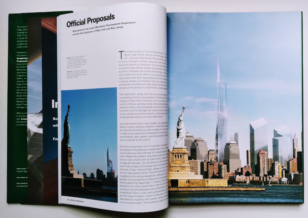 Imagining Ground Zero: Official and Unofficial Proposals for the World Trade Center Siteby Suzanne Stephens, with Ian Luna and Ron BroadhurstRizzoli/Architectural Record, October 2004Hardcover | 9-1/4 x 12-1/4 inches | 252 pages | English | ISBN: 9780847826575 | $60.00FROM THE FLAPS:The most important building competition in the world today, and the most important one since the international design competition for the Chicago Tribune Tower in 1922, is for the reconstruction of the World Trade Center in lower Manhattan. It has inspired a multitude of designs and has engaged architects on a global scale in the re-imagining of the twin towers' vacant sixteen-acre site.Published in conjunction with Architectural Record, the preeminent architecture journal in the United States, Imagining Ground Zero: Official and Unofficial Proposals for the World Trade Center Site documents not only the master plan competition, won by Studio Daniel Libeskind and sponsored by the Lower Manhattan Development Corporation, but also proposals submitted by invitation of and published by New York magazine, proposals from the exhibition at Max Protetch Gallery, as well as a selection from the more than 5,000 schemes submitted to the World Trade Center Memorial. The remarkable and authoritative survey features in depth the official scheme for the site, designed by David Childs of Skidmore, Owings & Merrill with the collaboration of Daniel Libeskind of Studio Daniel Libeskind; Reflecting Absence, the winning scheme for the memorial, designed by Michael Arad and Peter Walker; and, as well, the World Trade Center Transportation Hub, designed by Santiago Calatrava, DMJM + Harris, and STV Group.With its exhaustive approach to these myriad voices in the discourse surrounding the World Trade Center site, Imagining Ground Zero is destined to become the canonical reference for this unprecedented event in world architecture.Suzanne Stephens, who has a Ph.D. in the History of Architecture and Urban Development from Cornell University, is Special Correspondent for Architectural Record. Ian Luna is an architectural writer who edited Rizzoli's third volume on Kohn Pedersen Fox and Rizzoli's recent New New York: Architecture of a City. Ron Broadhurst is an architectural writer and editor.REFERRAL LINKS: dDAB COMMENTARY:Today is the 20th anniversary of the 9/11 attacks. With the anniversary this year falling on a Saturday, it seemed already determined that this "wayback weekend" post would be on the World Trade Center. But which book? Which of the dozen books in my library on the Twin Towers and post-9/11 rebuilding would suitably mark this occasion? With news stories leading up to today echoing that, with twenty years transpiring, many people are forgetting what it felt like on that Tuesday morning and the days after — heck, there are adults now that were even born after September 11, 2001! — I couldn't help think if the same applies to rebuilding: that people have forgotten how architecture was thrown into the spotlight after 9/11. There were some optimistic months and years when architects generated ideas and competed to realize them, before politics, money, real estate, and other interrelated powers turned the WTC site into what Michael Kimmelman summed up well recently as "a mess and [...] a massive, missed opportunity."If architects and other people have forgotten how architects responded to 9/11, Imagining Ground Zero is the best collection of their ideas and images on rebuilding — warts and all — between September 11, 2001, and the book's publication three years later. As the subtitle of the book makes clear, the designs assembled by Suzanne Stephens and other editors from Architectural Record include both official and unofficial designs for the WTC site. The former is highlighted by the "Innovative Design Study" that was spurred by the mediocre reception to master plans by Beyer Blinder Belle unveiled in July 2002. The designs by Studio Libeskind, which won the master plan competition, the THINK team, which actually published a "Ground Zero Diary" on their second-place design, and the other finalists are in these pages; now, like then, I think the designs come across as insular, out of touch with the larger public's attitudes toward rebuilding and views on the "sacred" site. Ironically, the "innovative design study" that was selected by Governor Pataki and the LMDC led to a "final" result whose built form strongly echoes one of BBB's master plan concepts, in which six towers, including one that looks a lot like One World Trade Center, abuts the memorial and its Twin Towers' footprints.Other official proposals in the book include the evolution of 1 WTC, then called Freedom Tower, a forced marriage between Libeskind and David Childs of SOM; the WTC Trasnsportation Hub, designed by Santiago Calatrava and one of the few elements of the site to get excited about at the time; and some entries from the 9/11 Memorial competition. (Both 1 WTC and the