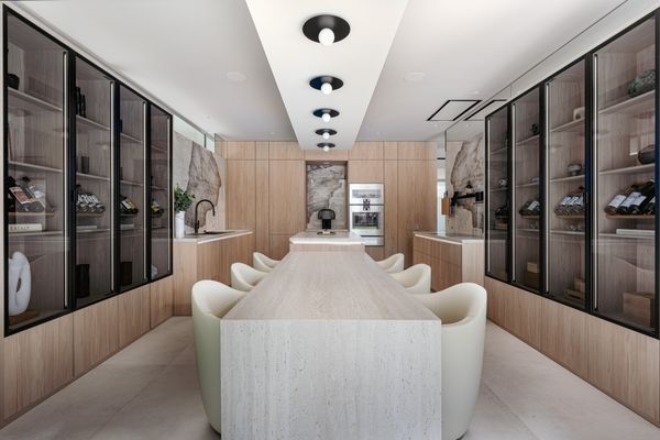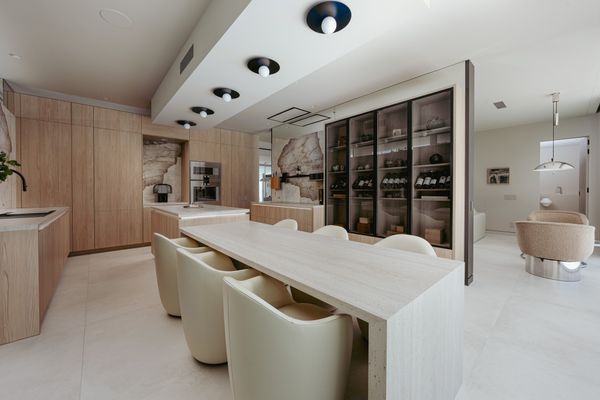 At its center, a custom Leicht kitchen features Gaggenau appliances, a dramatic 4-foot Galley sink, and curated lighting from Design Within Reach, all framed by Brazilian marble slab walls and warm Japanese pine paneling.