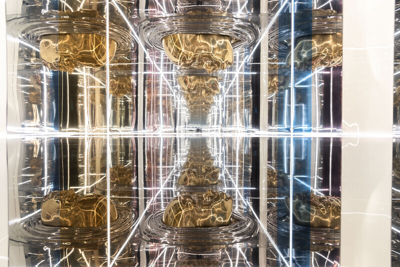 Matter transforms, giving life to a chamber of mirrors. This installation encourages reflection, self-reflection, and listening. A place outside of space and time, inhabited by an image that comes from afar to communicate with our inner selves.