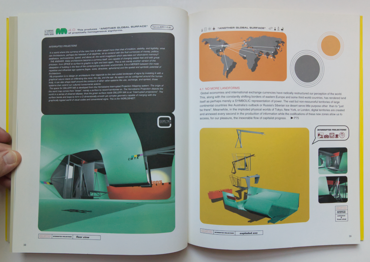 Interrupted Projections: Another Global Surface, or Territorial Recodings on the WorldSheetNeil DenariTOTO Publishing, September 1996Paperback | 8-3/4 x 11 inches | 87 pages | Japanese/English | ISBN: 9784887061422 | 1500¥EXHIBITION DESCRIPTION:GALLERY MA featured the work of the young Las Angeles architect Neil M. Denari in a show titled "INTERRUPTED PROJECTIONS." Denari has won wide acclaim for his various projects, such as his radical entry in the Tokyo International Forum Competition for which he received Honorable Mention. While not quite breaking free from the constraints of tradition and standards, Denari seems to challenge the conservatism of contemporary "architecture," always making viewers conscious of the essence of architecture and its latent potential.For Denari, contemporary architecture exists within a society filled with a mixture of coded images that trancends the concrete "thing" itself. Denari seeks to discover the possibilities of architecture within such a society, as well as how architecture can be made to fuse with society. Denari offered one solution to these questions in the space of GALLERY MA.The exhibition area was equipped with a NaviCam (support: Sony Computer Science Laboratory, Inc.), which will serve as a device for visualizing the concepts of the exhibition. Individual visitors could analyze concepts by accessing barcodes scattered throughout the exhibition area.GALLERY MA also sold "GALLERY MA BOOKS 04 Neil M. Denari INTERRUPTED PROJECTIONS," a graphic two-dimensional presentation of the show as realized in the three-dimensions of GALLERY MA.REFERRAL LINKS: dDAB COMMENTARY:One of the eighteen lecture introductions included in David Erdman's new book, Introducing: Short Essays on Influential Thinkers and Designers in Architecture, is for Neil Denari, the Los Angeles architect known best for a building in New York City, HL23. The lecture for which Erdman was introducing Denari took place in 2013, not long after that building's completion. Perhaps because the lecture was half a world away, in Hong Kong, Erdman focused mainly on Denari's earlier books and exhibitions, the output that brought him a good deal of attention in the 1990s, well before he had the opportunity to realize a building. One such exhibition was Interrupted Projections, which was on display at TOTO's Gallery MA in fall 1996 and was accompanied by a slim, handsome book of the same name.Rather than wait for Denari's much anticipated first monograph, Gyroscopic Horizons, which was a perpetual tease at the time — it was finally released in 1999 — I opted to buy Interrupted Projections when it came out, in one of many binges at Prairie Avenue Bookshop. Years later I scanned some pages from it for a "weekly dose" on the Massey Residence, one of seven projects in the book. The projects — all unbuilt, minus the exhibition itself — are documented with Denari's exacting graphic skill. He describes it in the introduction as "a graphic production," with "images and text [...] closely connected to form a visual experience of both an explanation and seduction" of the exhibition. Each project is its own "section" (1.0, 2.0, etc.) with a theme related to mass production, branding, globalization, and other concerns, spelled out in dense language very much of its time.The graphics also appear dated, especially the prevalence of boxes with rounded corners defining the boundaries of text and images. This was 1996, after all, when computers had already influenced graphic design and were just starting to work their way into architectural practice. Denari was an early adopter, using software to help model smooth forms and surfaces but also creating an aesthetic of computer-generated architecture. With very little white space, the book is a visual feast, with renderings and text fitted onto the page alongside barcodes, logos, colored shapes — any graphics to fill the page and convey a sense of coolness. I'm not sure how well the book captured the "visual experience" and "seduction" of the exhibition, but today it stands as an excellent illustration of architectural thinking twenty-five years ago.SPREADS: