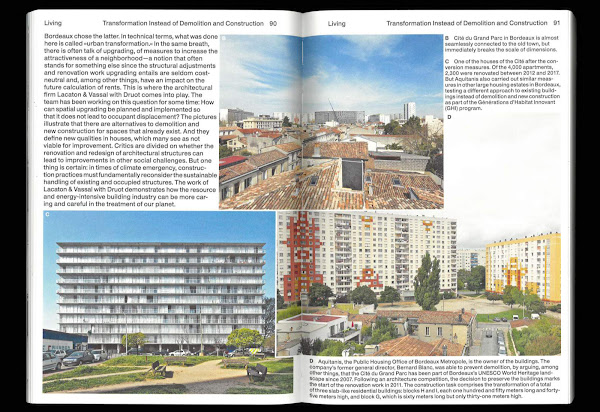 Living the City: Of Cities, People and Storiesby Lukas Feireiss, Tatjana Schneider, TheGreenEylSpector Books, September 2020Paperback | 8 x 11 inches | 340 pages | English | ISBN: 9783959054171 | 24.00€PUBLISHER'S DESCRIPTION:Cities are full of stories—running in parallel, contradictory, overlapping and inseparably linked. Such stories are told in Living the City by referencing various projects from architecture, art, and urban planning. The book aims to show processes and possibilities for action in cities based on more than fifty projects from all over Europe. The publication first looks at urbanites before expanding into emotionally and poetically charged stories that consider very basic activities such as loving, living, moving, working, learning, playing, dreaming, and participating in the city. The book is being published in conjunction with the exhibition of the same name at the former airport in Tempelhof, Berlin, which runs from September to November 2020.With works by Assemble, ateliermob, Ila Bêka & Louise Lemoine, Civic Architects, Crimson Historians and Urbanists, Eutropian, Larissa Fassler, Jeppe Hein, Thomas Hirschhorn,Lacaton & Vassal, No Shade, Olalekan Jeyifous, Ahmet Öğüt, Planbude, raumlaborberlin, Rotor DC, The Black Archives, White Arkitekter, Zones Urbaines Sensibles, and many more.Lukas Feireiss works as a curator, writer, and art director in the international mediation of contemporary cultural reflexivity beyond disciplinary boundaries. Tatjana Schneider is professor for history and theory of architecture and the city at the Department of Architecture, Technische Universität Braunschweig. Studio TheGreenEyl is a design and research practice based in Berlin and New York. They create exhibitions, installations, objects, images, interactions, and algorithms.REFERRAL LINKS: dDAB COMMENTARY:For the last few months of 2020, the Living the City exhibition took over the main hall of the former Berlin-Tempelhof Airport, presenting more than fifty "stories from architecture, art, and city planning." The former airport was supposedly "transformed into a venue for city life" by taking the form of "a walk-through urban collage." The companion book to the exhibition attempts a similar approach, presenting the 50-plus projects across eight chapters, each one prefaced by puzzle-like collages akin to the cover; these images illustrate the overlapping and contesting nature of doing projects in European cities. And although the projects follow one after the other, the density of words and images reads like a rapid-fire presentation of ideas focused on, as the title alludes, living in cities.The eight chapters (first spread, below) into which the various projects are inserted are, like many architecture books, suggestions; they are just one way of organizing projects that are not so easily compartmentalized. Most of them basically follow functional considerations (e.g., "Living" equals residential, "Moving" equals transit, etc.), but two chapters stand out from the rest: "Participating" and "Dreaming." The first is given 40 pages, considerably more than most chapters. It includes what I find the most intriguing project in the book, Lichtsingel, a multi-pronged pedestrian bridge in Rotterdam that is given the title "A Co-financed Bridge Generates New Impulses" in the book. The co-financing is clearly one aspect of its participatory nature, as is the fact it was devised by ZUS, which moved into the area twenty years ago and recognized its disconnect from other parts of the city; eventually the city got on board and helped pay for it and make it happen. Other projects in the chapter similarly explore how the public can be part of the processes that affect change in their neighborhoods.Before getting to Dreaming, another project in the book that stood out to me is the Kalkbreite Cooperative in Zurich, called "The Cooperative Housing Project Above a Tram Depot" in the book's "Living" chapter. It's the only project in the book I've seen in person, having actually stayed in the hostel portion of the large full-block building about five years ago when I was in the city for a World-Architects work retreat. It's a remarkable project, but not just for the fact it is built above a functioning tram depot. It is a truly mixed-use building, with retail, a cinema, and dining at grade, and residential floors above that have shared commons spaces. The apartments can be reached by a large public stair that leads to a raised courtyard, an open space that is public, but by being at a remove from the street is a safe space for the residents' children. Little did I know before seeing it in this book, but a stipulation to live at Kalkbreite is not owning a car, something that could only happen in a European city like Zurich.Unlike the eight projects in the Participating chapter, Dreaming, at the end of the book, features just one project: "An Afrofuturist Vision" by artist Olalekan Jeyifous. It features a couple of collages