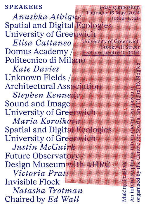 Speakers: Anushka Athique (Spatial and Digital Ecologies, University of Greenwich), Elisa Cattaneo (Domus Academy / Politecnico di Milano), Kate Davies (Unknown Fields / Architectural Association), Stephen Kennedy (Sound and Image, University of Greenwich), Maria Korolkova (Spatial and Digital Ecologies, University of Greenwich), Justin McGuirk (Future Observatory - Design Museum with AHRC), Victoria Pratt (Invisible Flock), and Natasha Trotman (Royal College of Art). The event will be chaired by Ed Wall (Spatial and Digital Ecologies, University of Greenwich).