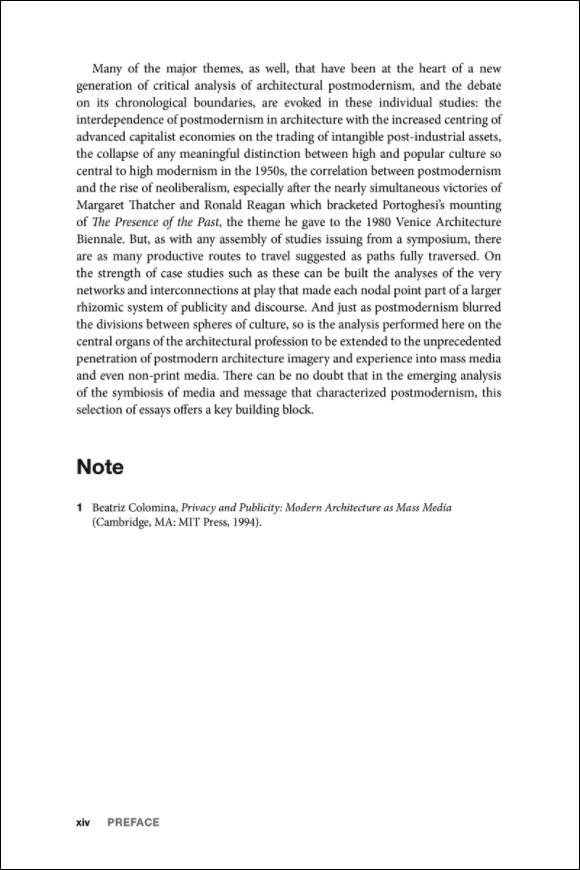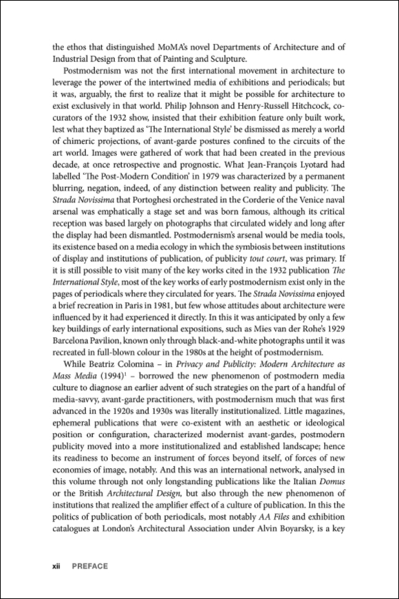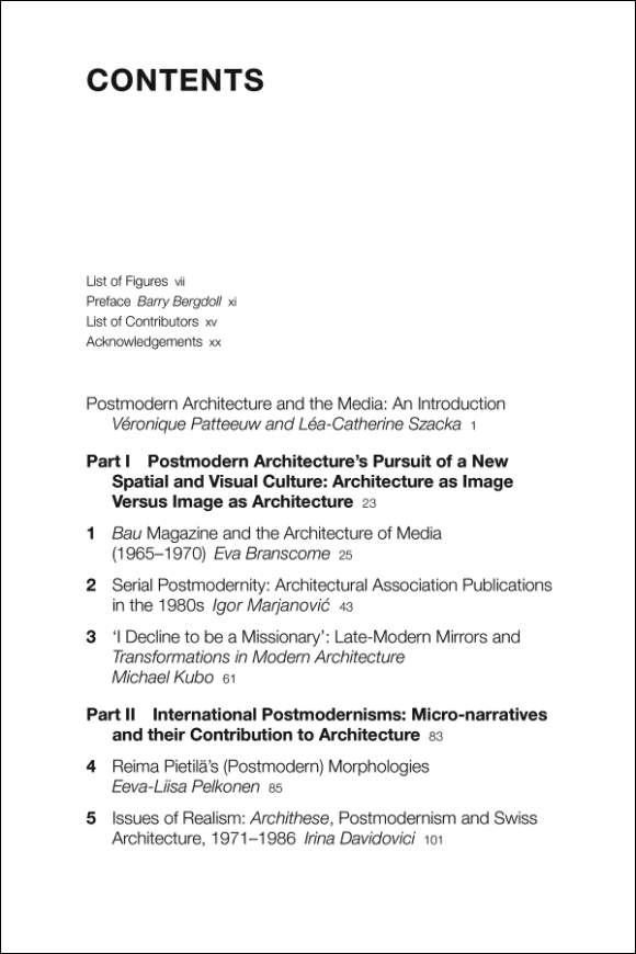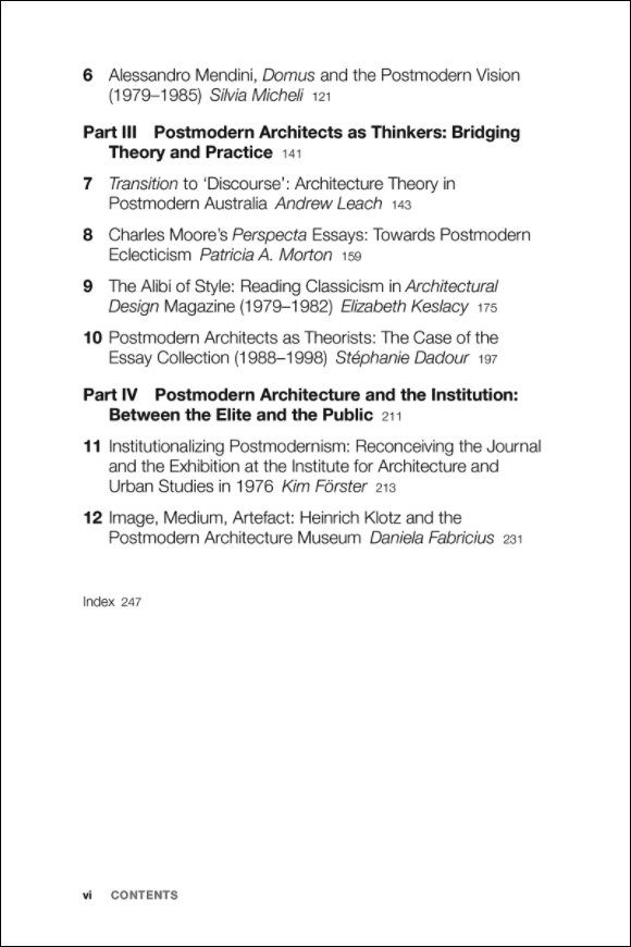 Mediated Messages: Periodicals, Exhibitions and the Shaping of Postmodern ArchitectureEdited by Véronique Patteeuw and Léa-Catherine SzackaBloomsbury Visual Arts, June 2018Hardcover | 6 x 9 inches | 280 pages | 38 illustrations | English | ISBN: 9781350170032 | $39.95PUBLISHER'S DESCRIPTION:Mediated Messages presents a collection of original writing exploring the role played by the media in the development of postmodern architecture in the 1970s and 80s.The book's twelve chapters and case-studies examine a range of contemporary periodicals and exhibitions to explore their role in the postmodern. This focus on mediation as a key feature of architectural post-modernism, and the recognition that post-modernism grew out of developments in the media, opens up the possibility of an important new account of post-modernism distinct from existing narratives.Accompanied by a contextualizing introduction, the essays are arranged across four thematic sections (covering: images; international postmodernisms; high and low culture; and postmodern architects as theorists) and present a range of case-studies with a genuinely international scope. Altogether, this work makes a substantial contribution to the historical account of architectural postmodernism, and will be of great interest to researchers in postmodernism as well as those examining the role of the media in architectural history.Véronique Patteeuw is Associate Professor at ENSAP Lille. Léa-Catherine Szacka is Lecturer in Architectural Studies at The Manchester School of Architecture, University of Manchester.REFERRAL LINKS: dDAB COMMENTARY:The most influential book in architecture's turn from modernism to postmodernism is almost universally agreed upon to be Robert Venturi's Complexity and Contradiction in Architecture. Written mostly in 1962 but not published by the Museum of Modern Art until 1966, selections of the book were released in Perspecta 9/10, a 1965 double issue of the student-run Yale Architectural Journal that was edited by a young Robert A. M. Stern when he was working toward a master's degree in architecture at Yale. Among other things, the early peek at Venturi's watershed book in Perspecta signals the importance of periodicals, which can put out projects, criticism, and other architectural content faster than books, and often focus on innovative, young voices who might not otherwise garner the attention of publishers, Venturi notwithstanding.Yale's Perspecta is the subject of one of the dozen essays in Mediated Messages, which, as the subtitle indicates, examines periodicals and exhibitions in the shaping of postmodern architecture. Although the context of the chapter, "Charles Moore's Perspecta Essays: Towards Postmodern Eclecticism" by Patricia A. Morton, omits Venturi's text, part of the chapter does address issue 9/10, since that double issue is also famous for Moore's lengthy essay, "You Have to Pay for the Public Life." (It eventually became the name of a posthumous anthology of texts written by Moore.) Morton also looks at two essay Moore wrote before and after 9/10: "Hadrian's Villa" from Perspecta 6 (1960) and "Plug It In, Ramses, and See If It Lights Up, Because We Aren't Going to Keep It Unless It Works" from Perspecta 11 (1967). Morton's essay tracing Moore's critique of modernism and hist theory of "place" is a highlight in a book that is full of them.It's hard for me to single out a few other essays to highlight, since this happens to be a book that overlaps greatly with my interests, which now are more firmly entrenched in architectural media (e.g., books, exhibitions) than architectural practice. Véronique Patteeuw and Léa-Catherine Szacka, the latter responsible for a great book on the 1980 Venice Architecture Biennale, have assembled a great cast of architectural historians with interests that veer to publishing, exhibitions, and the like. Igor Marjanović, who co-wrote an excellent book on Alvin Boyarsky and the Architectural Association, is here, addressing the books and periodicals put out by the AA in the 1980s, focusing on the serial nature of their output. Irina Davidovici, another historian who wrote a book I really liked, focuses on the Swiss architecture magazine Archithese, which was launched under Stanislaus von Moos in 1971 and helped define the "Realism" that was basically the country's version of postmodernism. As a last example, Kim Förster, whose dissertation on the Institute for Architecture and Urban Studies (IAUS) will be published someday for wider dissemination, hones in on the journals and exhibitions produced by the IAUS in 1976.These essays by Marjanović, Davidovici, Morton, and Förster are respectively found in the book's four thematic chapters: "Postmodern Architecture's Pursuit of a New Spatial and Visual Culture: Architecture as Images Versus Image as Architecture," "International Postmodernisms: Micro-narratives and their Contribution to Postmodern Architecture," "Postmodern Architects as Thinkers:
