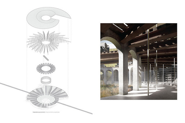 Memory HousesRobert Hutchison ArchitectureArquine, March 2020Hardcover | 7 x 9-1/2 inches | 152 pages | 90 illustrations | English/Spanish | ISBN: 978-6079489526 | $32.00PUBLISHER'S DESCRIPTION: Seattle-based architect Robert Hutchison’s Memory Houses is a project that investigates mortality and memory through the lens of architecture. Speculatively situated along the banks of the Wye River on the Eastern Shore of Maryland where the architect grew up, architectural typologies such as dwelling, chapel, lighthouse and memorial weave together a spatial narrative about loss and recollection. Distant as well as more recent architectural memories make cameo appearances in the memory houses: the stave churches of Norway and the Great Mosque of Córdoba that Hutchison experienced as a child; the lighthouses of the Chesapeake Bay; the timber grain elevators of the Palouse; the Colosseum and the Santo Stefano Rotondo in Rome. This publication, with a hot-stamped cover and end sheets printed with Hutchinson’s designs, documents the eight buildings that comprise the Memory Houses project, alongside built houses designed by Hutchison’s Seattle-based firm Robert Hutchison Architecture. Robert Hutchison is a practitioner, researcher, and educator whose interests and practice overlap the fields of architecture, art and photography. ... After working for the Miller|Hull Partnership and serving as a principal of Hutchison & Maul Architecture, Hutchison established the architecture studio Robert Hutchison Architecture. REFERRAL LINKS: dDAB COMMENTARY: Looking through the designs by Seattle architect Robert Hutchison that are collected in Memory Houses, I can't help but think of Douglas Darden, whose only monograph, Condemned Building, was released three years before he died from leukemia at 43 years of age. Just as Darden's beautifully delineated projects — all of them unbuilt — were centered around his impending death, the main projects in Hutchison's book were sparked by the dementia that took over his father's mind and eventually his life. Hutchison's House for Remains, for example, recalls such Darden projects as Oxygen House (the end-of-life house was designed for a fictional person who was clearly a surrogate for Darden) in terms of both a poetic tone and an architectural expression to match. Although Hutchison's line drawings and computer renderings won't be mistaken for Darden's lushly shaded drawings, the moody images in Memory Houses are very appealing, a refreshing antidote to hyper-realistic renderings and other trendy architectural images. The beautifully crafted hardcover book contains sixteen houses by Hutchison's eponymous firm: eight of them built and eight of them unbuilt. These built and unbuilt projects alternate throughout the book; the former are presented with primarily black-and-white photos, a tactic that makes them seamlessly meld with the desaturated renderings of the latter. The eight unbuilt "memory houses" — the book's raison d'être — are located on a waterfront site in Maryland, on land that Hutchison's parents owned when he was a young architect but had sold by the time of his father's dementia. Sited in a line from northeast to southwest (first spread below), the projects comprise an architectural exploration of a poetic path: across space and time, the latter culminating in death. A highlight of these projects is the House for Locomotives, a nautilus-shaped building (seen in the other spreads below) that picks up on the existence of a railroad spur accessing the site while also referring to a domed church in Rome. The latter brings us to Hutchison's year spent at the American Academy in Rome a year after his father died. He acknowledges the time at the Academy as "critical to the development and resolution of this project." In Rome he honed his interests in geometry and architectural typologies, in particular "how one might 'sample' and collage them to create new architectures." These words again echo Darden, who developed the forms for his projects by layering seemingly disconnected images atop each other. Hutchison's projects — built and unbuilt, temporary and permanent — are more platonic, using gables, cylinders, and other forms to explore function through familiar forms. Writing that sentence makes me also think of Aldo Rossi, whose theories of memory and typology preferred such architectural forms. But ultimately Hutchison's architecture is his own, suffused with these and other influential voices but staking out a position that is as personal as it is poetic. SPREADS: