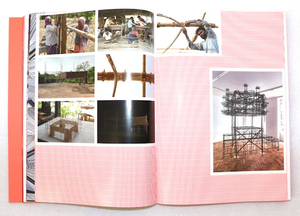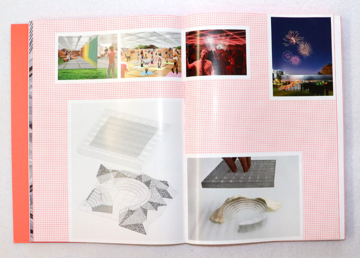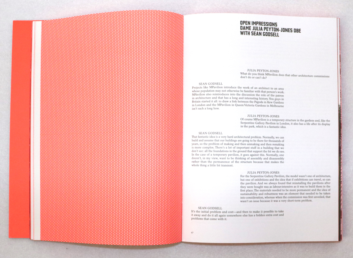 Each commission is documented in the book in chronological order, with a short text and numerous photographs. A few glossy spreads are inserted after every couple projects, one showing the design processes for all of the MPavilions (third and fourth spreads below), one highlighting the architectural models of the same, and one depicting the structures in their post-MPavilion "second lives." Roughly the last 40 pages give a sampling of some of the events — the "public encounters" — that took place each summer in the pavilions at Queen Victoria Memorial Gardens. Graphically, the book's many parts are unified by bright orange, which grew out of the visual identity developed by Studio Ongarato starting in 2014. For the most part, the orange is successful (when closed, as in the photo above, the book is particularly striking), but the pages with orange text on white or pink paper are headache-inducing to this 40-something reader. Luckily those texts are a rarity in this celebratory document of a project that has created some attention-getting settings for "debate, entertainment, education" and the exchange of ideas.
