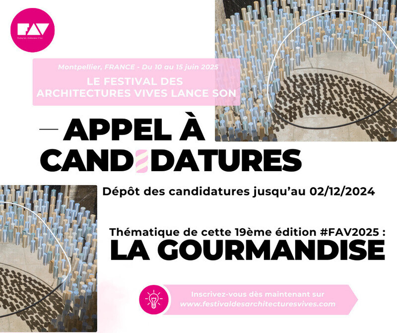 Montpellier, FranceAssociation Champ Libre - Festival des Architectures Vives (FAV)Event + Exhibition, Art, Competition, Culture, Installation + Public art, Lifestyle, Sustainable Development, Travel, Urban DesignMontpellier - France To mark the 19th edition of the Festival des Architectures Vives, from June 10-15, 2025, the Champ Libre association is inviting applications for 10 projects to be carried out as part of the Festival.The FAV will take place in the heart of the city of Montpellier, in the Ecusson district and, more specifically, in the inner courtyards of certain private mansions, offering visitors a journey of architectur... (continued)