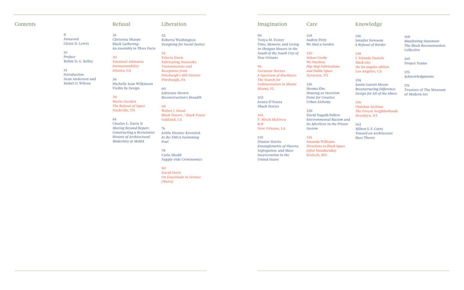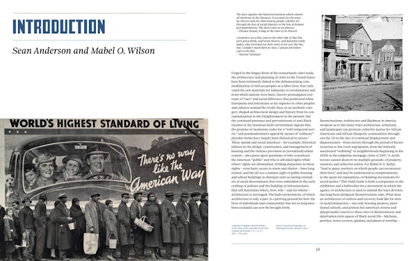 Reconstructions: Architecture and Blackness in AmericaSean Anderson, Mabel O. Wilson (Editors)The Museum of Modern Art, March 2021Paperback | 8 x 10 inches | 176 pages | 185 illustrations | English | ISBN: 978-1633451148 | $45.00PUBLISHER'S DESCRIPTION:Reconstructions: Architecture and Blackness in America is an urgent call for architects to accept the challenge of reconceiving and reconstructing our built environment rather than continue giving shape to buildings, infrastructure and urban plans that have, for generations, embodied and sustained anti-Black racism in the United States.The architects, designers, artists and writers who were invited to contribute to this book—and to the exhibition at the Museum of Modern Art for which it serves as a “field guide”—reimagine the legacies of race-based dispossession in 10 American cities (Atlanta; Brooklyn, New York; Kinloch, Missouri; Los Angeles; Miami; Nashville; New Orleans; Oakland; Pittsburgh; and Syracuse) and celebrate the ways individuals and communities across the country have mobilized Black cultural spaces, forms and practices as sites of imagination, liberation, resistance, care and refusal.A broad range of essays by the curators and prominent scholars from diverse fields, as well as a portfolio of new photographs by the artist David Hartt, complement this volume’s richly illustrated presentations of the architectural projects at the heart of MoMA’s groundbreaking exhibition.Sean Anderson is Associate Curator, Department of Architecture and Design, The Museum of Modern Art. Mabel O. Wilson is Nancy and George E. Rupp Professor, Graduate School of Architecture, Planning and Preservation, and Professor, Department of African American and African Diaspora Studies, Columbia University.REFERRAL LINKS: dDAB COMMENTARY:A few days after it opened on February 27th, I made my way to MoMA to see Reconstructions: Architecture and Blackness in America, the fourth in the museum's occasional "Issues in Contemporary Architecture" series. Like its predecessors, which tackled global warming (Rising Currents: Projects for New York’s Waterfront in 2010), the American housing crisis (Foreclosed: Rehousing the American Dream in 2012), and the growth of informal cities around the world (Uneven Growth: Tactical Urbanisms for Expanding Megacities in 2014), Reconstructions is a timely exhibition aligned with pressing issues. Billed as "an investigation into the intersections of architecture, Blackness and anti–Black racism in the American context," the exhibition comes one year after George Floyd and BLM, and two years after MoMA (finally) broached its own racist tendencies with the publication of Among Others: Blackness at MoMA.One of the contributors to Among Others is Mabel O. Wilson, the Columbia University professor who is also co-editor of the important Race and Modern Architecture: A Critical History from the Enlightenment to the Present and co-curator of Reconstructions, with MoMA's Sean Anderson. In "White by Design," Wilson explores the clearly discriminatory history of how the collection of the Architecture & Design Department at MoMA has been formed. Between its creation in 1932 and the publication of Among Others in 2019, only two objects by African American designers entered the collection, according to Wilson: a swatch of fabric by textile designer Joel Robinson in 1975 and a print of a collage by architect Gordon Kipping in 2000. Anything by Paul R. Williams? Nope. J. Max Bond Jr.? No, again. These and other glaring omissions can be attributed, in part, to Philip Johnson, who set up the A&D Dept. and has been called out recently for his Nazi sympathies, with calls to remove his name from titles and other honorifics at MoMA and elsewhere. The entrance to Reconstructions actually drapes a textile with a statement by the Black Reconstruction Collective over a gallery sign with Johnson's name on it.Those who can make it to MoMA before Reconstructions closes on May 31st (a short run of just three months, due no doubt to COVID-19) are strongly encouraged to do so. The eleven contributions to the show are excellent, filling the galleries with models, collages, drawings, and videos that are striking to behold. None of the pieces, though, are explicit in terms of purpose or idea; they invite closer inspection to determine what they have to say. Some of the projects are clearly architectural but most of them are provocations that spark visitors to consider the troubled histories of racism in the United States, as explored in ten urban communities selected from among the dozens of "All Black Towns" created in the short Reconstruction era after the Civil War. Those ten cities and eleven contributions comprise about half of the companion publication to the exhibition. Organized in five chapters ("Refusal," "Liberation," "Imagination," "Care," and "Knowledge"), the projects alternate with specially commissioned texts that range from the academic to the personal. The essay