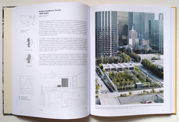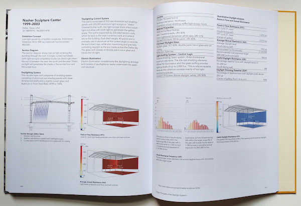 Renzo Piano Building Workshop: Space - Detail - Lightby Edgar StachBirkhäuser, July 2021Hardcover | 9 x 11-2/4 inches | 160 pages | English | ISBN: 9783035614602 | 39.95€PUBLISHER'S DESCRIPTION:The Pritzker laureate Renzo Piano is recognized worldwide as one of the most renowned architects of our time. Central elements of his aesthetics include the playful use of natural light, the transparency of his buildings and their fine detailing.This publication documents nine museum buildings by Renzo Piano Building Workshop.Prof. Edgar Stach, College of Architecture and the Built Environment, Thomas Jefferson University, Philadelphia.REFERRAL LINKS: dDAB COMMENTARY:One of the highlights of a trip to Dallas a decade and a half ago was an afternoon spent at the Nasher Sculpture Center, the downtown museum designed by Renzo Piano with a generous sculpture garden by Peter Walker and a "skyspace" by James Turrell. The museum being open past sunset afforded dramatic sky-changing views from within Tending, (Blue), making Turrell's contribution to the museum particularly memorable. But in 2013, ten years after the Nasher opened to the public, the skyspace closed, when the artist declared it "destroyed" after a new 40-story residential tower east of the Nasher encroached upon the sculpture's square patch of sky.That tower, with its elliptical floor plan guaranteeing reflecting light scattered in all directions throughout the day, also impacted the garden and the building's interior, sending reflected sunlight directly into the north-facing light scoops that were designed to exclusively introduce indirect light. Even with legal protections in place for the museum at the time of its completion, development trumped — and destroyed — art, forcing the Nasher to retrofit its skylights to protect its artworks and the vision of the original. It doesn't appear that any retrofit has been put in place at the Nasher, though, as solutions were proffered by the tower developer in 2013 but then dropped in 2015; by October 2018, in one of the latest articles I could find on the issue, nothing had been done.Edgar Stach, in his analysis of nine museums designed by the Renzo Piano Building Workshop, including the Nasher, mentions the issue in a few sentences, but all of the drawings, details, photographs, and daylight analysis (spreads, below) treat the museum as if Museum Tower never happened. This makes sense, given that the book is about the design of the museums, specifically the of the skylights that enable natural light to enter gallery spaces without the damaging effects of direct sunlight. If anything, the Nasher dilemma illustrates the precision by which RPBW designs the custom fins and scoops for its museum projects, their roofs responding carefully to climate and context. As such, the slightest change to the context can be destructive.Continuing with the Nasher, but setting aside the Museum Tower debacle, the museum is documented in Stach's book across fifteen pages in a format that is consistent across all nine museums. A dozen pages (first four spreads) are in part one, "Nine Museums by Renzo Piano Building Workshop," alongside the case studies on the eight other museums (Menil, Beyeler, Morgan, Broad, etc.). The other three pages come later in the book, in the second part on "Natural Light in Museums by Renzo Piano Building Workshop." The book's two parts can be seen simply as architecture followed by engineering; I wish the latter, with its charts and illuminance renderings (last spread), was combined with the former, creating all-in-one case studies that don't involve any flipping back and forth (the even/odd page numbers are probably why this didn't happen). The analysis by Stach and the documentation of the RPBW museums by Stach and his students is highly commendable, aided by the consistent formatting, the depth of documentation, and the inclusion of technical information. Very few architects in the world will receive commissions like the Nasher and the other museums included here, so the relevance of Piano's solutions to other projects is more about method and inspiration than direct application. Even though Piano's uses two types of museum roofs (fins and scoops) as defined in Stach's analysis, he doesn't repeat the same solutions on multiple projects. This expresses the site-specificity of each design, again, but it also conveys the desire of each institution to create a special setting for their art — the illuminated overhead planes being integral parts of those settings.SPREADS: