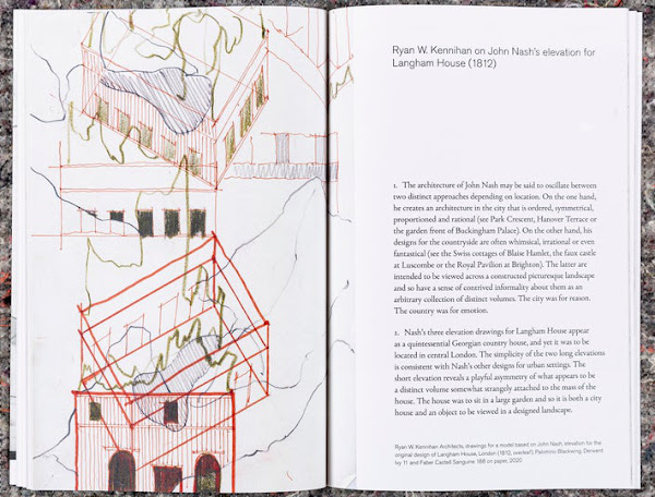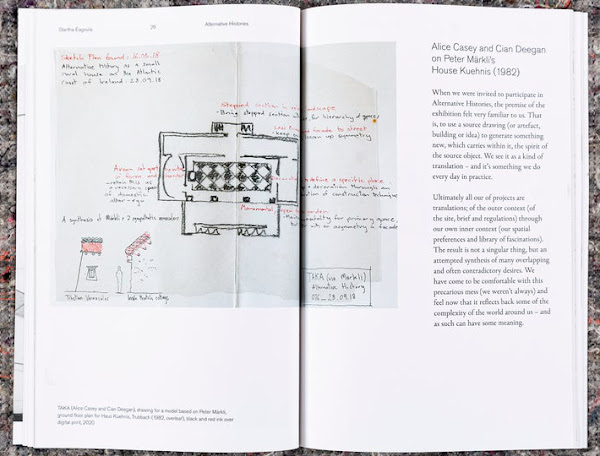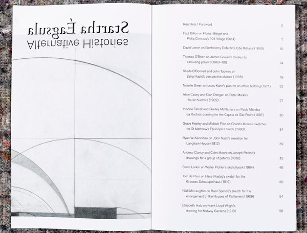 Startha Éagsula / Alternative HistoriesSarah Handelman (Editor)Drawing Matter/Irish Architectural Archive, 2020Paperback | 6-1/4 x 9-1/2 inches | 64 pages | English (foreword also in Gaelic) | ISBN: 978-1916152212 | £14.00PUBLISHER'S DESCRIPTION: First presented in London in 2019, Alternative Histories invited 85 practices in the UK and Europe to respond to archival drawings held in the collection of Drawing Matter with models of their own. For the occasion of the show’s presentation at the Irish Architectural Archive in Dublin, the curators invited nine additional Irish or Irish-based architectural practices to join the original five. This catalogue brings together the voices and processes of these 14 participants, providing an opportunity to reflect and to consider contemporary Irish architecture in contexts at once European and historical. dDAB COMMENTARY: The last of the three legs of the traveling exhibition Alternative Histories opened on December 3rd at the Irish Architectural Archive, a couple months later than planned due to COVID-19. The exhibition, curated by architects Jantje Engels and Marius Grootveld from Ghent, solicited 85 architects to build models that responded to drawings from the archive of Drawing Matter, based in Somerset, England. The old drawings and new models were documented in the impressive large-format catalog that I reviewed back in November. Marking the exhibition's conclusion is a special supplementary catalog, Startha Éagsula / Alternative Histories, that expands upon the original by adding nine more Irish architects to the five that were in the original exhibition. The combined fourteen original drawings and new contributions from Irish architects are documented in Startha Éagsula / Alternative Histories, but the presentation is dramatically different from the first catalog in a few ways. First, the format is smaller and the book is bound traditionally with glue, unlike the first's unique folded and stitched construction. Second, most of the contributions are documented through drawings rather than models; this means readers are seeing the process that leads to the exhibition models rather than those finished products. Third and last are the words of the fourteen architects from Ireland, one element that was not part of the first catalog. Ranging from a few sentences to a few pages, the texts by the architects are particularly illuminating. They are informal glances at how they interpreted the drawing they were given. Sheila O'Donnell and John Tuomey, for instance, discuss their appreciation of Zaha Hadid's architecture, particularly in her early days, and explain how they responded to her perspective studies from 1986 for an office building. Later in the book, Elizabeth Hatz's drawing for her model of Frank Lloyd Wright's Midway Gardens (shown on the cover) is accompanied by prose that touches on World War I, which started one month after Midway Gardens opened, as well as the murders at Taliesin that happened one month later: "In Midway Gardens architecture intersects life, drawing intersects history, energy intersects death." These are just two examples that reveal how architects can be inspired by individual drawings, which in some cases are just a few lines on a piece of tracing paper. SPREADS:
