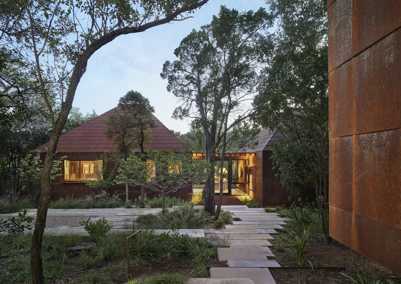 Description: "Overlooking the Guadalupe River, River Bend is a home designed to sit lightly upon the land, minimizing disruption to the site and existing trees. Envisioned as a home that embraces the outdoors, the residence is composed of four structures housing the separate functions. While one structure houses the kitchen, dining, and living areas, a second houses the primary suite, creating a private escape. A third structure functions as an art studio, and the final structure serves as a carport, which was designed to be adapted into future additional living space. Corten siding was used on the exterior for its robust qualities and minimal maintenance. The two primary structures are located on a relatively steep slope and are primarily supported by piers to minimize excavation, reducing the impact on the site. Only the back third of the buildings on the sloping portion of the site sit on grade, and these areas were carefully located to minimize tree removal in construction. Only six trees were removed to build all four structures, minimizing the impact on the abundant wildlife habitat. The three conditioned buildings are located above the surrounding canopy in order to provide greater access to the prevailing wind patterns and enhance natural ventilation. Skylights provide balanced daylight, allowing for a lower amount of glazing on the exterior walls."
