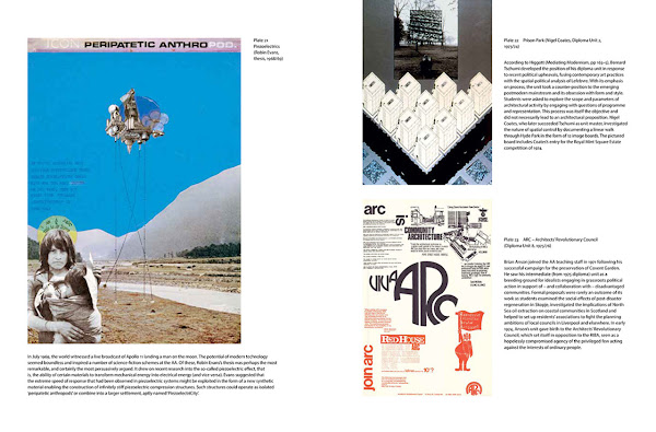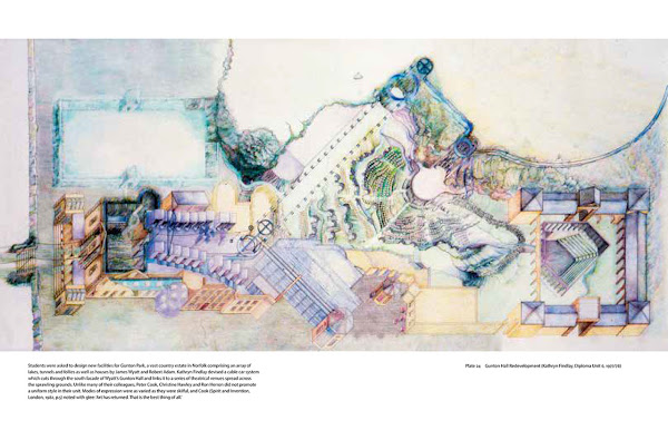 Politics and finances, as well as architectural ideology, make up a lot of Zamarian's text, which is the product of his doctoral research carried out in England after studies at ETH Zurich, as far removed from the AA as any architecture school. As such, the book will be of particular interest to people interested specifically in the AA, more generally in architectural pedagogy, and/or in the evolution of architectural education in the middle of the 20th century. Accompanying the detailed though readable text are dozens of illustrations by students over those postwar years: most are b/w, presented alongside the text, though 25 color plates are found in the back of the book (spreads, below). These student projects are at a far remove architecturally from Hadid's Malevich's Tectonik, but the names are just as familiar: Nigel Coates, Nicholas Grimshaw, Cedric Price, and Richard Rogers, among numerous others. With lengthy captions on each student project, the illustrations are more than eye candy; they add even more information concerning a time and a place that previously had only a shortage of it.