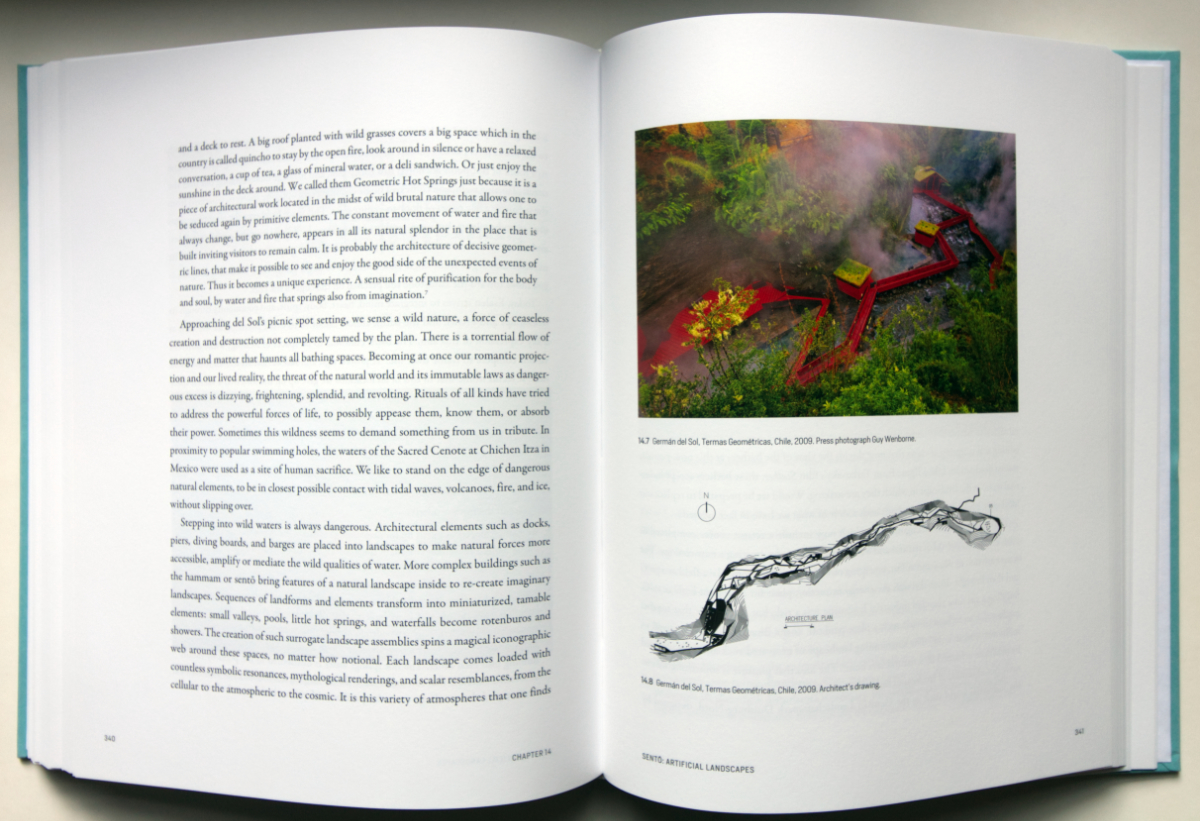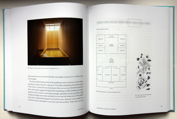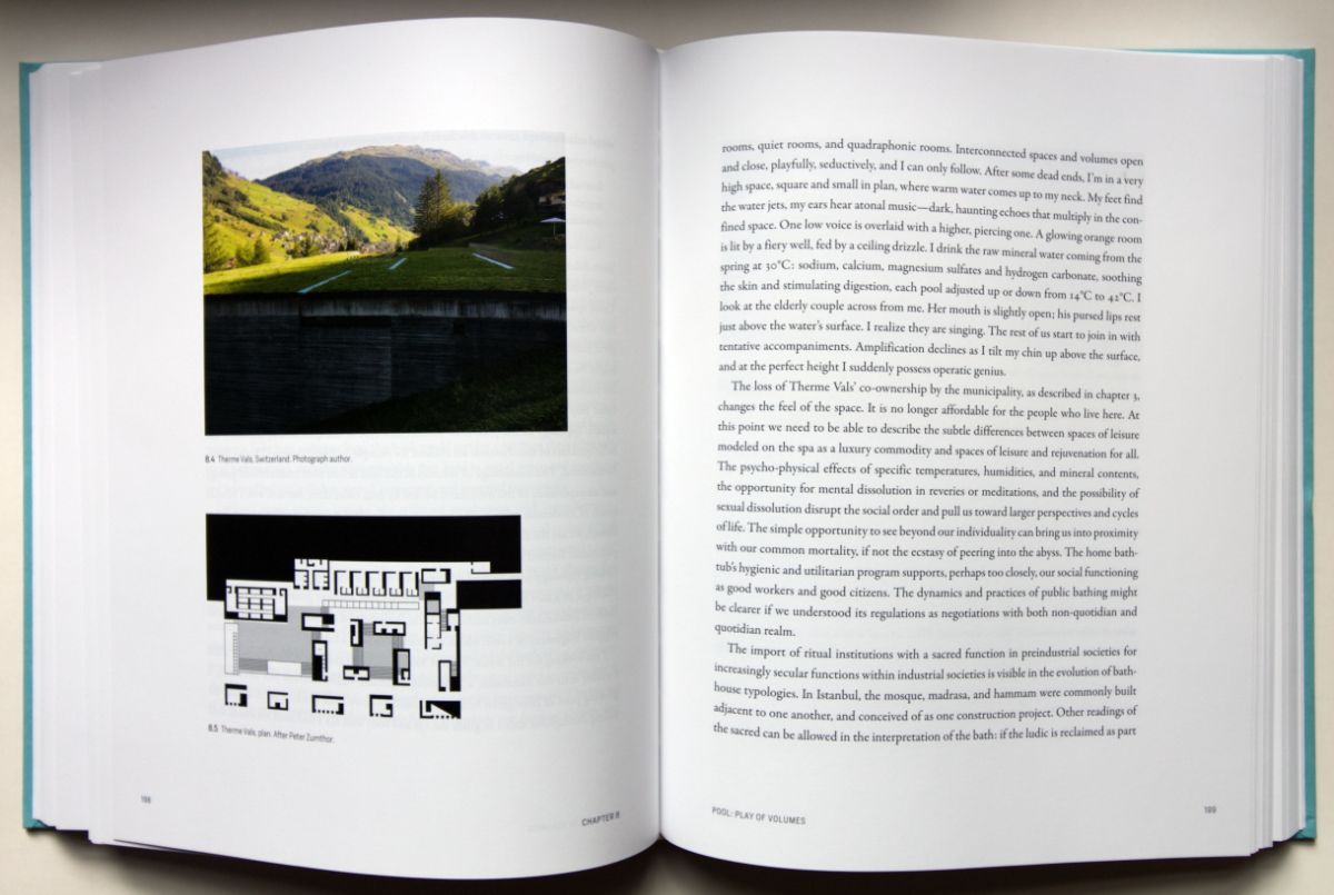 The Architecture of Bathing: Body, Landscape, ArtChristie PearsonThe MIT Press, October 2020Hardcover | 8 x 10 inches | 424 pages | 266 illustrations | English | ISBN: 9780262044219 | $49.95PUBLISHER'S DESCRIPTION: We enter the public pool, the sauna, or the beach with a heightened awareness of our bodies and the bodies of others. The phenomenology of bathing opens all of our senses toward the physical world entwined with the social, while the history of bathing is one of shared space, in both natural and built environments. In The Architecture of Bathing, Christie Pearson offers a unique examination of communal bathing and its history from the perspective of architecture and landscape. Engagingly written, with more than 260 illustrations, many in color, The Architecture of Bathing offers a celebration of spaces in which public and private, sacred and profane, ritual and habitual, pure and impure, nature and culture commingle. Pearson takes a wide-ranging view of her subject, drawing on architecture, art, and literary works. Each chapter is structured around an architectural typology and explores an accompanying theme—for example, tub: sensuality; river: flow; waterfall: rejuvenation; and banya: immersion. Offering examples, introducing relevant theory, and recounting personal experiences, Pearson effortlessly combines a practitioner's zest with astonishing erudition. As she examines these forms, we see that they are inextricable from landscapes, bodily practices, and cultural production. Looking more closely, we experience architecture itself as an immersive material and social space, embedded in the interdependent environmental and cultural fabric of our world. Christie Pearson is an award-winning architect, writer, and urban interventionist. An Adjunct Professor at the University of Waterloo School of Architecture, she is coeditor of the architectural journal Scapegoat. REFERRAL LINKS: dDAB COMMENTARY: In summer 2013, I was fortunate enough to travel with a friend from the city of Zurich to the village of Vals and spend a day inside the famous Therme Vals designed by Peter Zumthor and completed in 1996. That visit happened one year after the Commune of Vals sold the baths and attached hotel to property developer Remo Stoffel, who rebranded it 7132, hired famous architects to design hotel suites, brought in Morphosis to design a new entrance canopy, and audaciously proposed Europe's tallest tower, also designed by Morphosis, to sit next to the baths. Thankfully the 82-story tower was basically dead on arrival, but as noted by Christie Pearson in her book-length exploration of bathing, the sale of the property meant "[the bath] is not longer affordable for the people who live here." In effect, the sale turned Therme Vals from "a space of leisure and rejuvenation for all" to a "spa as a luxury commodity," in the author's words. Pearson discusses Therme Vals across just three of The Architecture of Bathing's 424 pages. This says to me that the author is not particularly interested predominantly in the design of baths (this is far from a collection of contemporary designs, though the spreads below reveal that they are still found in the book), while her comments about the sale of Therme Vals indicate an interest in bathing as a social activity over anything else. Nevertheless, Zumthor's baths are found in a chapter called "Pool: Play of Volumes," in which Pearson explores the spatial and phenomenological aspects of bathing, moving from James Turrell and other artists to the words of Henri Lefebvre and Steen Eiler Rasmussen, before reaching Vals and then moving onto other people and places, including Zaha Hadid's London Acquatics Center completed for the 2012 Olympics. Space and design are important in The Architecture of Bathing, but so is philosophy, literature, and other fields of study. Pearson's text mixes sometimes grandiloquent statements about the act of bathing ("Bathing spaces foreground tensions in resistance to and affirmation in life..."), firsthand accounts that transport us to her destinations ("I pack all the towels and swimsuits, pack and repack, water bottle, sunscreen...wait, how many towels? Big or small?"), and general commentary about bathing and other aquatic acts spurred by those visits ("The swimming pool can draw to itself a dozen architectures of bathing within its enclosure..." after a visit to Hadid's building). Pearson's "people's history of bathing," as she calls it in the introduction, is a highly ambitious one. With so many histories, ideas, places, etc. intertwining themselves among chapters that describe venues but also states of mind (e.g., "Sea: Rhythmic Theater" or "Sweat Lodge: Healing Transgressions"), it's easy to get lost or carried away in the aquatic tangle. Thankfully, the index directs readers to places that are subjective ("Taboo") as well as real ("Therme Vals"), which readers will no doubt want to visit after reading the book. SPREADS: