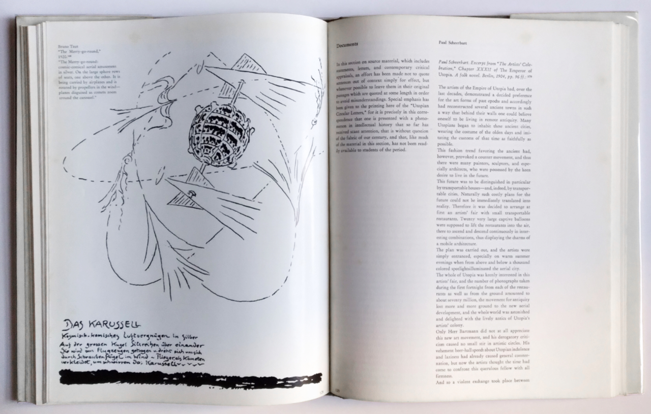 Connecting the two books, beyond just Conrads' name, is the presence of primary texts. They make up the whole of Programs and Manifestoes, but in Fantasy they are relegated to the third of the book's three main sections. These "Documents," some of which would resurface later in the other book, reference the second section, "Illustrations," and its 100 glossy pages with b/w photos and drawings. The first section, "The Architecture of Fantasy," is the authors' 20-page text on the themes uniting the diverse range of talent and designs on display in the book. Utopia, obviously given the book's subtitle, is a key theme, one spelled out by the authors but more convincingly found in the drawings by Bruno Taut, Antonio Sant'Elia, Frederick J. Kiesler, and many others. At the time, the designs collected in the book were not widely disseminated, but six decades later they are much more well known, if still overshadowed by the lingering impact of the International Style, both on scholarship and the built environment.
