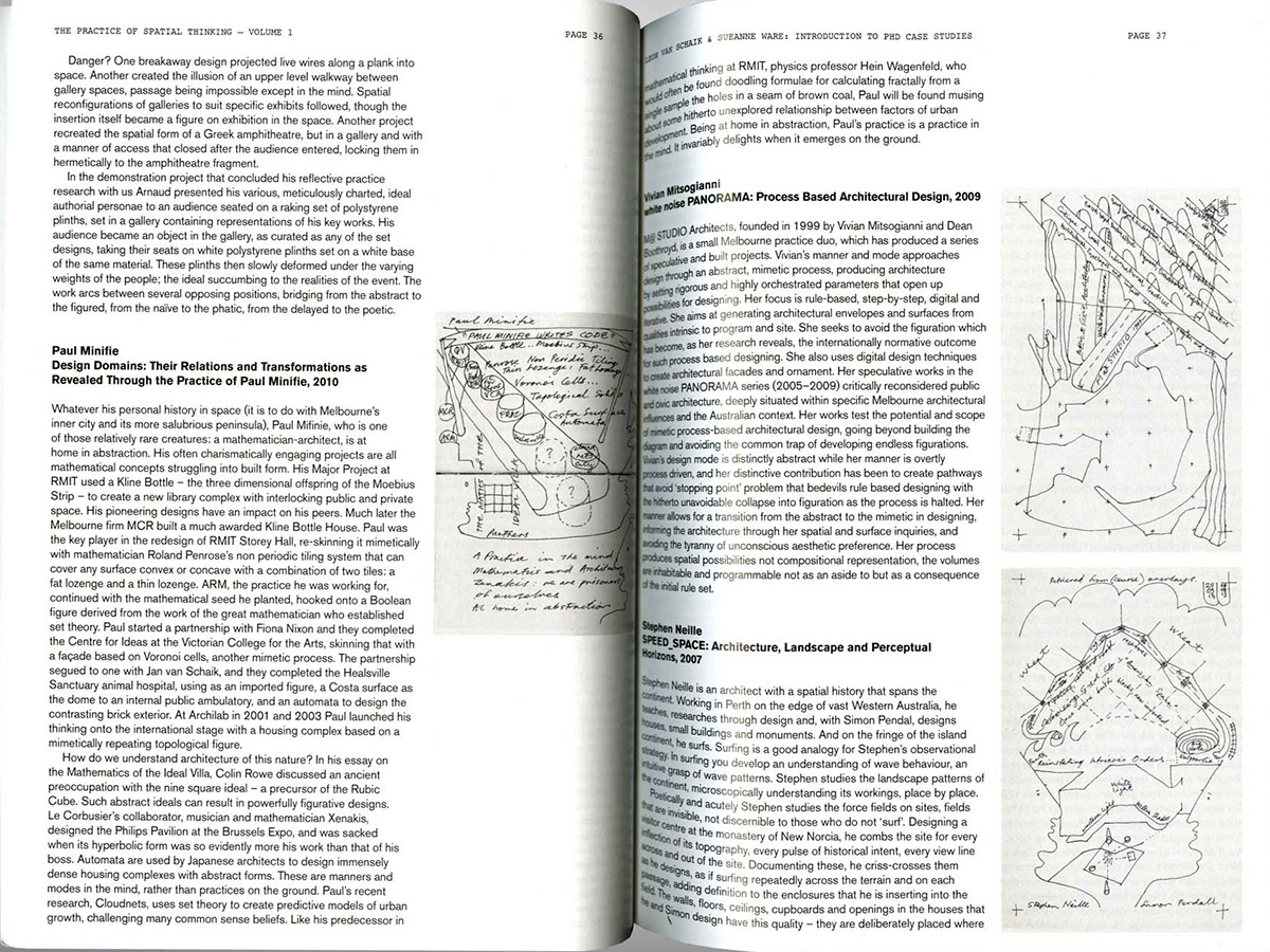 The Practice of Spatial Thinking: Differentiation Processes, Second EditionLeon van Schaik, SueAnne Ware, Colin Fudge, Geoffrey London Actar Publishers/School of Architecture & Urban Design at RMIT University, January 2020Paperback | 8-1/2 x 11 inches | 232 pages | English | ISBN: 978-1948765350 | $29.95PUBLISHER'S DESCRIPTION: How do designers in research-driven practices differentiate themselves from each other and form distinctive platforms for future practice? The research presented in this second edition and carried out in Australia as part of an Australian Research Council Discovery Program is of significance for design practice, review, and our deeper understanding of the design of space and spaces. In continuing the exploration of spatial intelligence,” this research further develops our understanding of designers, how they work and what they draw on through their lives that shapes their spatial thinking, and their practice. The research also provides broader insights into a more public understanding and acknowledgement of our collective spatial intelligence. It shows how this could be developed and enhanced to provide more spatial and design literacy in our communities, and how these can engage with their changing environments. REFERRAL LINKS: dDAB COMMENTARY: In 2013, the School of Architecture and Urban Design at RMIT University published the first volume of The Practice of Spatial Thinking: Differentiation Processes, aka The Black Book. Presenting the research carried out as part of an Australian Research Council Discovery grant, the book focused on the "spatial intelligence" of design practices in a specifically Australian context. In turn, its release was limited, best I can gather, to Australia. With its second edition, the research done under the tutelage of Leon van Schaik, SueAnne Ware, Colin Fudge, and Geoffrey London is being shared with an international audience. The Design Practice Research program at RMIT is more than 25 years old, but the second Black Book presents working coinciding with the ARC Discovery grant, spanning primarily from 2009 to 2015, or the years following the publication of van Schaik's Spatial Intelligence in 2008. Early in The Practice of Spatial Thinking, spatial intelligence is defined as "the human capacity upon which architects, landscape architects and urban designers build their capacity for spatial thinking, their unique skill base." By focusing on practice, the research enables an understanding of the different techniques used by designers, while also illuminating how anyone — not just architects and the like — could tap into "our collective spatial intelligence" toward developments in their own communities. Design Practice Research is ambitious but also ambiguous and, by definition, very meta; it is educational research focused on the hows of architectural design more than the designs themselves. Or so it seems. It's hard to determine what aspects of the eighteen PhD case studies that make up the bulk of The Practice of Spatial Thinking are specific to the research at RMIT. To me, the case studies are presented simply as designs, with some commentary, or navel gazing, about the process of design thrown into the mix. Why my confusion? Perhaps I'm not reading the case studies deeply enough, or, better yet, perhaps I'm the wrong audience. Most likely the target audience is found in academia: architectural educators interested in the unique approach outlined by van Schaik decades ago and carried further in recent years by him and his colleagues. A best case scenario sees their research influencing how design reviews are done in other architecture schools: in a manner that focuses on the understanding of spatial intelligence in students and which, in turn, makes them better environmental designers. SPREADS: