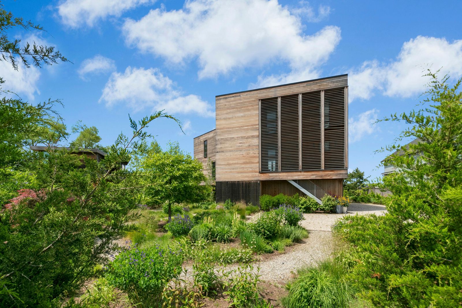 The wood-clad Connecticut residence has a thriving garden, rooftop solar panels, and 100 feet of waterfront land.
