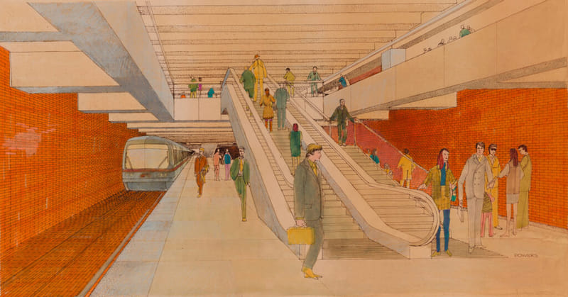 The exhibition centers on the desire of BART designers to encourage middle-class passengers commuting from Bay Area suburbs to use public transport to downtown San Francisco. The approach included “aesthetically pleasing” stations in landscapes that would “make a contribution to the community through which [BART] passes.”