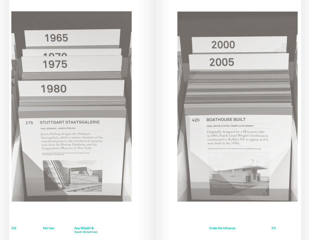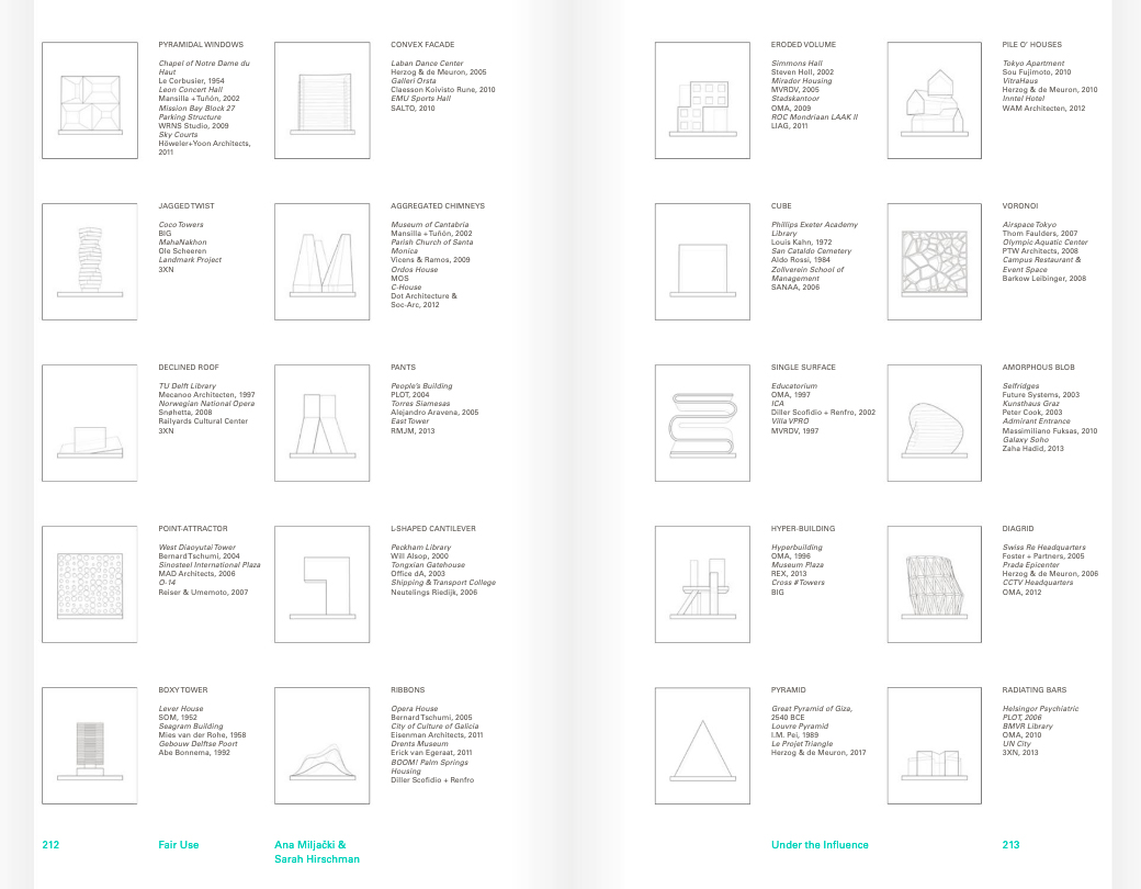 Under the Influence: A SymposiumAna Miljački (Editor)Actar Publishers, January 2020Paperback | 5-1/4 x 8-1/4 inches | 220 pages | English | ISBN: 978-1948765152 | $24.95PUBLISHER'S DESCRIPTION: The Under the Influence book is based on the eponymous symposium, which brought together scholars and practitioners of architecture in order to focus on one of the most anxious disciplinary topics: influence. The symposium invited each of the participants to illuminate a single term—a disciplinary synonym for appropriation—and through that term, the specific strategies, historical, and disciplinary circumstances in which it is enmeshed. It was organized and hosted by Ana Miljački, and presented by the MIT Department of Architecture. With some small additions this is a reprint of that book. Influence is not easily quantified. It is elusive, even when we casually admit to it as we ogle images on the internet, or feel ourselves softening our resolve on an important issue in light of a beautifully crafted piece of rhetoric; or as the mass-media drone imperceptibly rewires some of our most fundamental desires. When Under the Influence symposium took place at MIT in 2012, the invitation to discuss issues of originality and copying in architecture were still taboo. There have been a number of projects on the topic since, but they have hardly exhausted the topics of copying and copyright, whose importance increases with every act of scrolling or “liking” architectural images on Instagram. Ana Miljački, PhD is an Assistant Professor of Architecture at Massachusetts Institute of Technology, where she teaches theory and design. REFERRAL LINKS: dDAB COMMENTARY: Seven years is a long time between a symposium and its publication. Under the Influence took place at the MIT Department of Architecture over two days in February 2013 (not 2012, per the publisher's description), but my copy of the accompanying publication of the same name arrived just shy of seven years later. Why the delay? Turns out that Under the Influence from Actar is a republication of the 2014 edition by SA+P Press, with some changes. First are some postscripts, which ironically preface the proceedings; these find some of the symposium participants revisiting their papers or remarks, expanding upon them with work they've done in the interim. Second are occasional comments in the following texts that provide context or make the notes more accurate. On the whole, though, the book is close to the original, therefore acting as an accurate document of the symposium and arguing for the continued relevance of the theme. (Based on the first book's page on the MIT website, it looks like the design of the book remains the same as well, though I prefer the graphic on the cover of the SA+P edition to the Actar edition.) Under the Influence features a dozen architects and educators tackling a variation on the term "appropriation." Florian Idenburg (SO-IL), for example, discusses "allusion" while Michael Meredith (MOS) talks about "collection" and Amanda Reeser Lawrence focuses on "revision." It appears that Ana Miljački, who organized the symposium and edited the book, selected words aligned strongly with the work of the participants. Reeser Lawrence, for instance, revisits her book on James Stirling (a book that revisited her dissertation on him), who she describes as "one of post-war Modernism's most accomplished and provocative revisioners." Following the symposium structure, the book groups the dozen contributions into three groups of four, each followed by transcripts of the discussions that took place on February 23, 2013. Departures from this structure are a few: Mario Carpo's keynote from February 22 and an essay by Nader Tehrani, then chairing the MIT Department of Architecture, both at the beginning; at the end of the book is documentation of Fair Use, an exhibition that accompanied the symposium and was based on a workshop led by Miljacki and Sarah Hirschman. As can be grasped in the spreads below, the exhibition gathered modern and contemporary projects by formal similarities, showing how even architects striving for invention are guilty of appropriation. With architecture's slowness, these sorts of formal memes continue to the present, spread by such websites as ArchDaily, Designboom, and Dezeen. In some ways then, very little has changed in seven years. SPREADS: