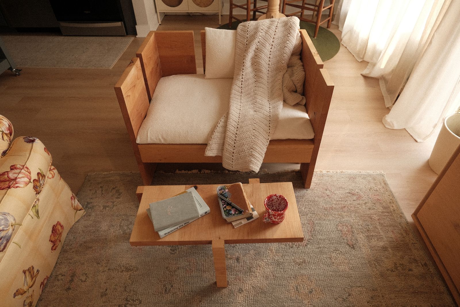 Harrison created her Homebody chair while getting her masters in interior architecture at the University of Oregon. "The prompt was to design a chair that fit you and your needs and your body," she says. She decided to build her ideal morning chair, perfectly suited to her early-riser routine. That meant a little storage space and a spot where she could rest a book or a cup of coffee. She also likes to keep her feet propped up. The result was a cousin to the telephone benches of the mid-20th century, with heavy aesthetic influence from furniture by Donald Judd. Included is a little removable table that can serve as a built-in side table or a coffee table/footstool. The TikTok came a couple of years later, after Harrison had graduated and moved back to Nashville. She was working nine to five at an interior design and architecture firm and wanted a creative outlet outside of her day job, so she started playing around with the platform.