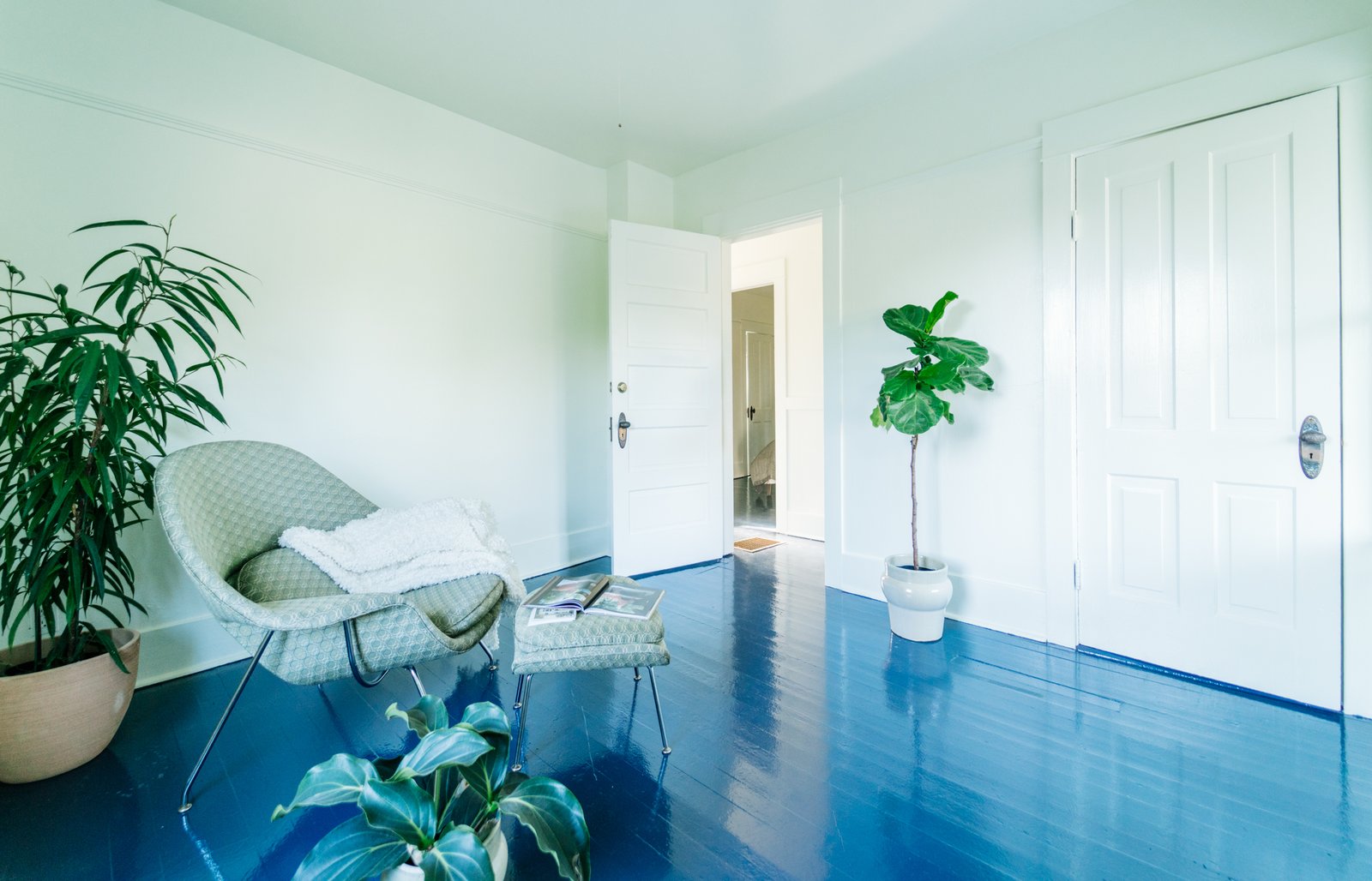 The walls match the floors in tone, but not necessarily in sheen—the floor is finished in Benjamin Moore Floor & Patio paint in Balsam 567, as well as three coats of Minwax polyurethane.