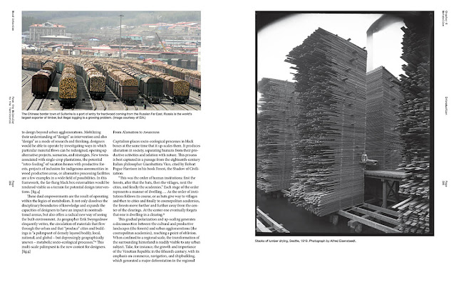 Wood Urbanism: From the Molecular to the TerritorialDaniel Ibañez, Jane Hutton, Kiel Moe (Editors) Actar Publishers, November 2019Hardcover | 8 x 10-1/4 inches | 488 pages | English | ISBN: 978-1945150814 | $54.95PUBLISHER'S DESCRIPTION: Wood holds unique and timely lessons for urbanization, yet it remains inadequately characterized in architecture, landscape architecture, and urbanism. From under-considered thermal properties to emerging manufacturing possibilities, from changing forestry regimes to larger carbon cycle dynamics, Wood Urbanism explores the unique material and scalar properties of wood, presenting it as a critical material for design today. It brings into conversation scholars and practitioners who focus on wood from a range of perspectives: from the working forest to the mid-rise building to the basic cell. Drawing from the inherent intelligence and depth of multiple disciplines, this book offers a transcalar perspective on the role of wood in contemporary urbanization: from the imperceptibly small to the confoundingly large. REFERRAL LINKS: dDAB COMMENTARY: If one word jumps out throughout Wood Urbanism, it's not "wood" or "timber" or even "carbon." It's "trans-scalar." With a movement "from the molecular to the territorial," as the subtitle indicates, the book examines wood across multiple scales. To do so it must rely on the expertise of multiple disciplines: architects, landscape architects, and urban designers, for sure — this book came out of an event at Harvard GSD, after all — but also scientists, artists, photographers, and geographers. Fittingly, it is edited by an architect (Moe), an architect/urbanist (Ibañez), and a landscape architect (Hutton). Wood Urbanism is organized through sixes. There are six chapters that follow the trans-scalar approach: Species, Carbon, Thermal, Ecology, Urbanism, and Metabolism. Each chapter is then broken down into six contributions: an Introduction by one of the editors; a Position piece by a relevant expert; a Case, Project, and Prospect, all basically short case studies; and a Visual Essay that articulates the scale in an unexpected way. With this structure, the 36 contributions to the hefty book are roughly equal parts technical, design, and eye candy. An illustrated glossary at the back of the book is the only departure from the six-by-six structure, one that defines concepts that emerged in the course of the book's research and creation. Building in timber is not as simple as designing a form and then — harking back to my student days — selecting wood rather than steel and concrete. It is most successful when the design process involves a deep understanding of the material's behavior, chemistry, ecology, and so forth. Wood Urbanism is not a one-stop shop for architects interested in building with mass timber rather than steel and concrete, but the book's trans-scalar, trans-disciplinary approach makes it a must for any designer who wants a broad, intellectual understanding of the potentials of the most sustainable material around. SPREADS:
