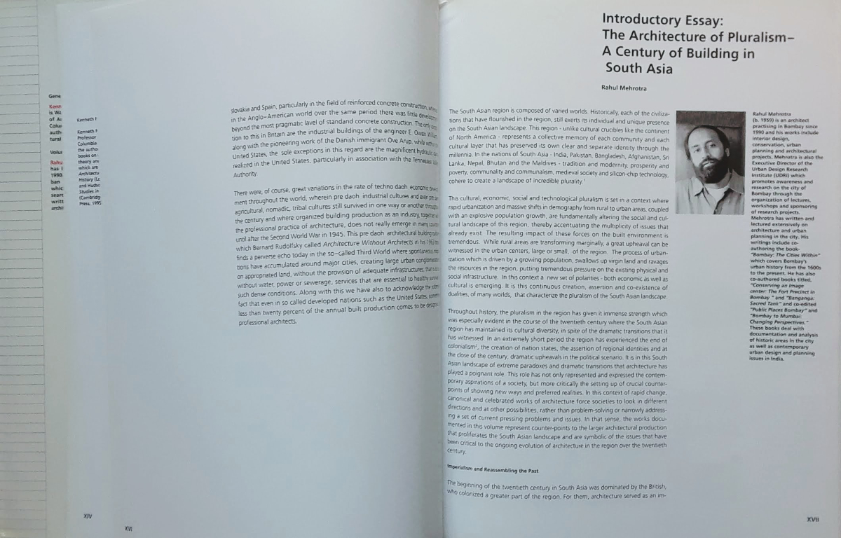 World Architecture 1900-2000: A Critical Mosaic, Vol. 8: South AsiaKenneth Frampton (General Editor), Rahul Mehrotra (Volume Editor)China Architecture & Building Press/Springer Verlag, 2000 Hardcover | 9 x 11-1/2 inches | 260 pages | 380 illustrations | English | ISBN: 3211832912PUBLISHER'S DESCRIPTION: At the close of the 20th century, this series of 10 volumes recording the century's most significant architectural achievements and covering all parts of the world will be published. Altogether 1000 buildings and urban complexes have been selected by noted architecture writers and critics. Within each volume, one hundred significant examples represent the political, economical, cultural and demographic evolution of the particular region over the century. The evident complexity of the enterprise cannot entirely exclude a few arbitrary choices. Not only does the selection of procedure reflect individual choices, but also the division of the globe into transnational regions of vastly differing size and character evokes a specific appearance of World Architecture. Thus this architectural collection is to be understood as a critical mosaic representing as a whole the entire evolution of World Architecture from 1900 to 2000. – Wilfred Wang Kenneth Frampton is Ware Professor at the Graduate School of Architecture, Planning, Preservation, Columbia University, New York. He is the author of numerous books on architectural theory and history. Rahul Mehrotra has been an architect in Bombay [sic] since 1990. He is Executive Director of the Urban Design Research Institute (UDRI), which promotes awareness of, and research on, the city of Bombay. He has written several books and articles on architecture and urbanism. REFERRAL LINKS: dDAB COMMENTARY: Three years ago on this blog I discussed the 10-volume World Architecture 1900-2000 series that Kenneth Frampton edited with a slew of volume editors, associate editors, and nominators. Each volume covers a different geographical region (Volume 1 is Canada and the United States, Volume 4 is Latin America, etc.) and consists of 100 important buildings completed throughout the 20th century. All told, the series highlights a whopping 1,000 buildings, making for a truly international sampling of mainly modern architecture last century. But very few people know about the books, especially when compared to Frampton's famous Modern Architecture: A Critical History, which was released in 1980 and just saw its fifth edition published. My blog post from 2017 mentioned how helpful the books were for me in the research phase of 100 Years, 100 Buildings, and it drew attention to a lecture by Frampton in which he lamented the poor distribution of the ten books. I concur with Frampton, as I was able to get half of the books used for reasonable amounts (less than $30 each), but when I search out the remaining titles now, their prices approach $100, both prohibitively expensive and a sign of their rarity. With so much effort put into each title, especially by the volume editors and the various critics and historians who nominated the buildings for inclusion, the relative obscurity of these books is a shame. I was spurred to pull Volume 8 off my bookshelf after reviewing Working in Mumbai, the "not a monograph" on RMA Architects, the firm of Rahul Mehrotra, earlier in the week. Working in Mumbai is the latest book by Mehrotra, whose website indicates more than 20 titles, though the list does not include this volume of World Architecture 1900-2000 that he edited. Most of the books are focused on India, particularly Mumbai; his most well known book is Architecture in India: Since 1990, which came out in 2011. Clearly Mehrotra has long been invested in researching and disseminating information on the architecture of India and South Asia, so he was clearly the best person for the editorial job. Given India's population and geographical area, it's no surprise that most of the 100 buildings in this volume are located there; the other countries are Bangladesh, Pakistan, and Sri Lanka. Mehrotra's 14-page introduction puts the region's 20th-century architecture into political contexts, though with Frampton at the helm of the whole undertaking, architecture as an expression of regional identity comes to the fore, not surprisingly. The 100 building descriptions that follow the introduction focus on history and architecture and are accompanied by photos and drawings. Every building is given two pages, though some important buildings are given more. References are provided for each building, and these are very helpful for people who want to learn more than what just a few paragraphs allow. SPREADS: